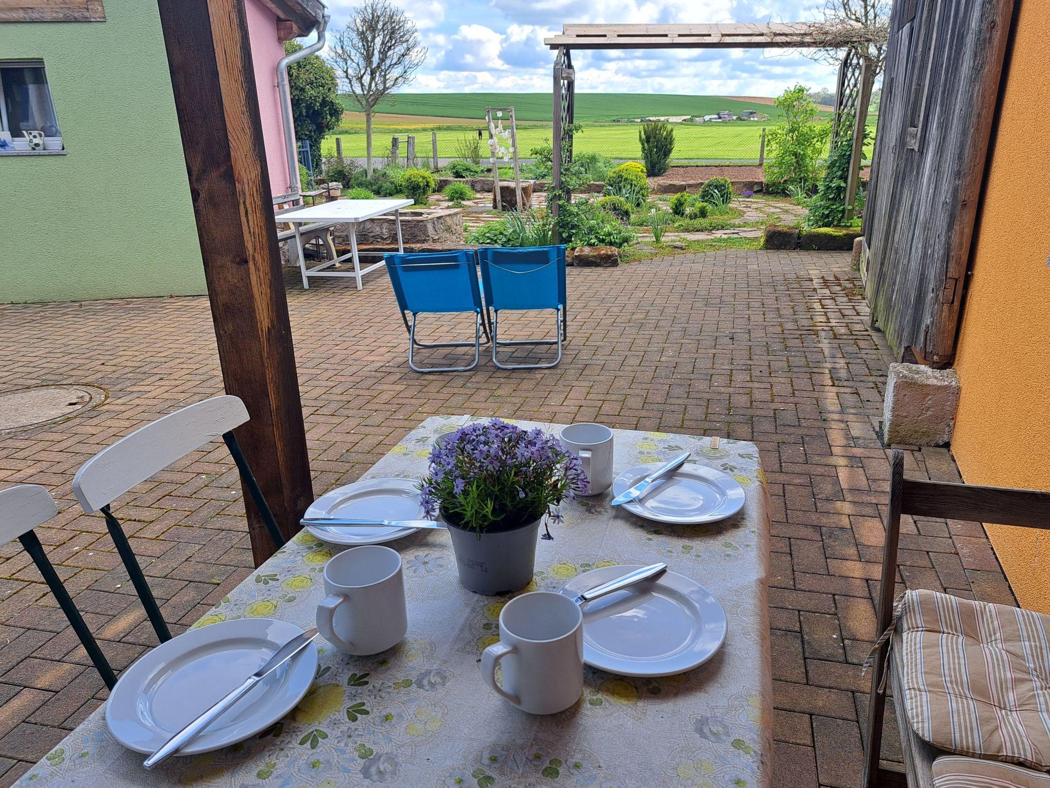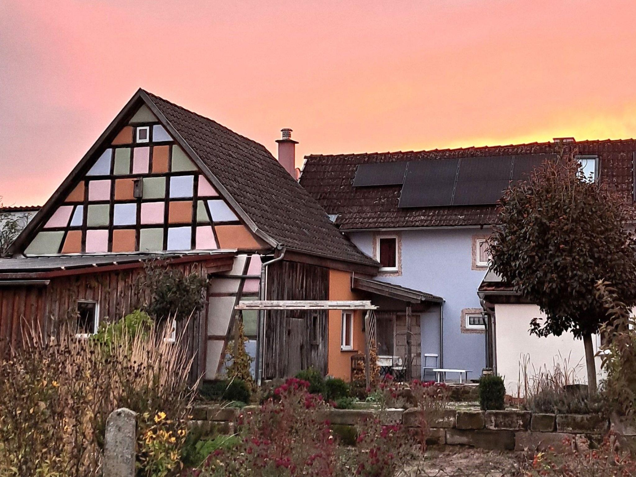 Quiet, idyllic, high fairytale-like equipment with highest comfort. 4 DTV stars - direct access to hiking trails and good connection via largely deserted roads to renowned cycle paths, a lovely, slightly hilly landscape in the Haßberge Nature Park, good shopping facilities for conventional and organic food with short distances, including a village shop (1 km on foot, bike or car) with high-quality organic products from the counter-star water fun, garden, meadows and terraces. Additional hire of the yoga room possible.