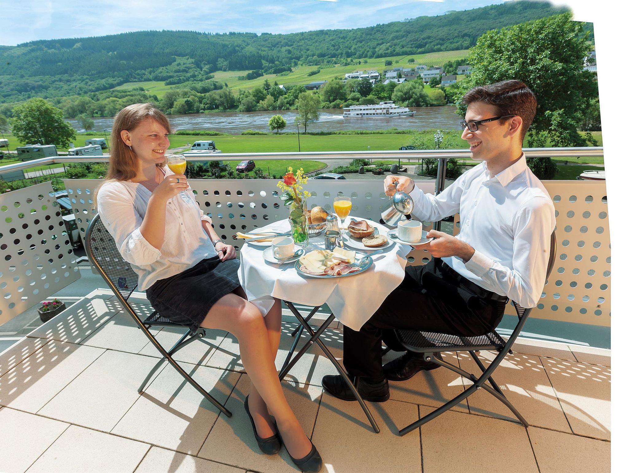 Moderne Doppelzimmer mit Balkon und Moselblick, Tresor, TV, Bad mit Dusche, Kosmetikspiegel und Fön