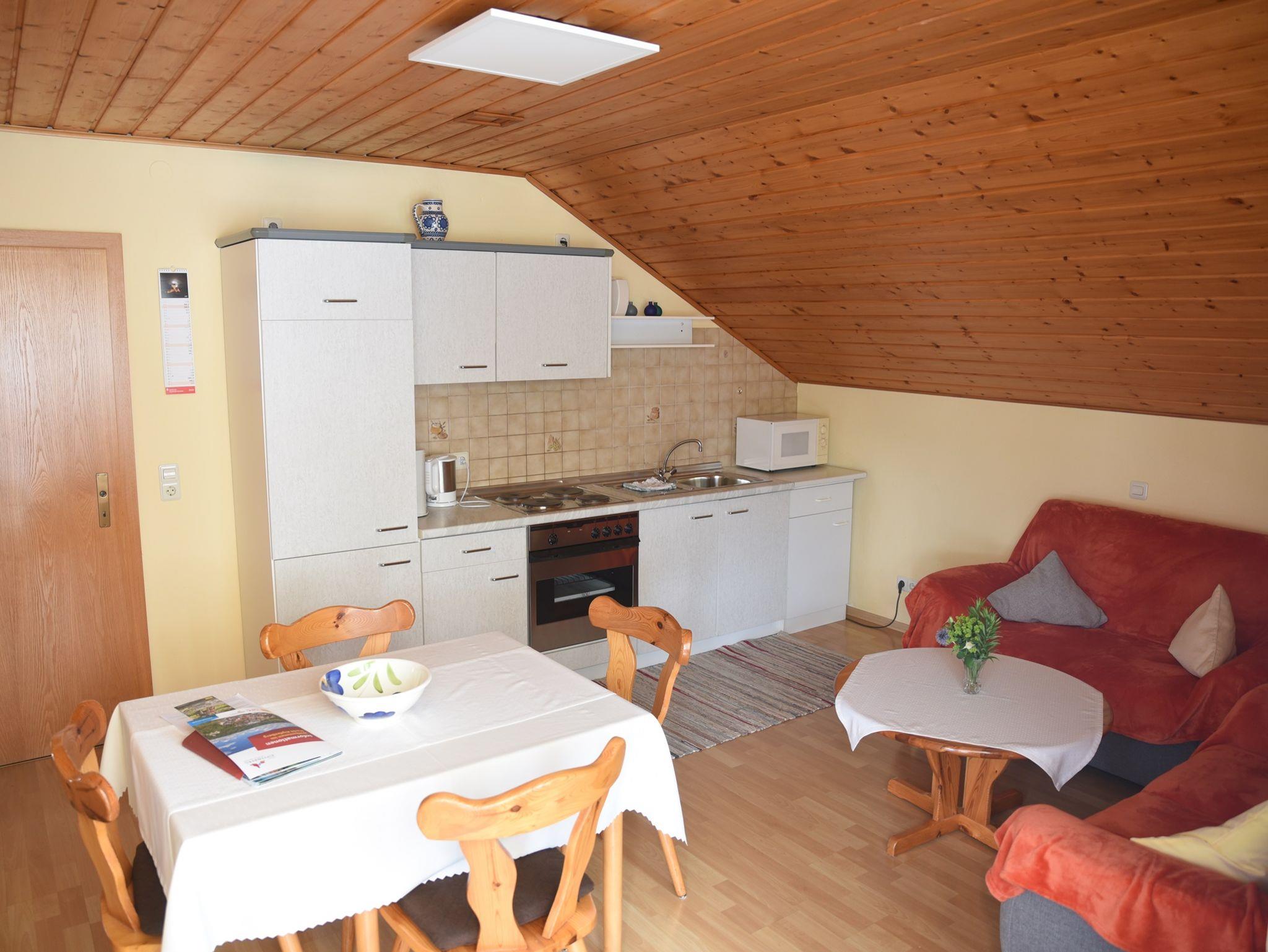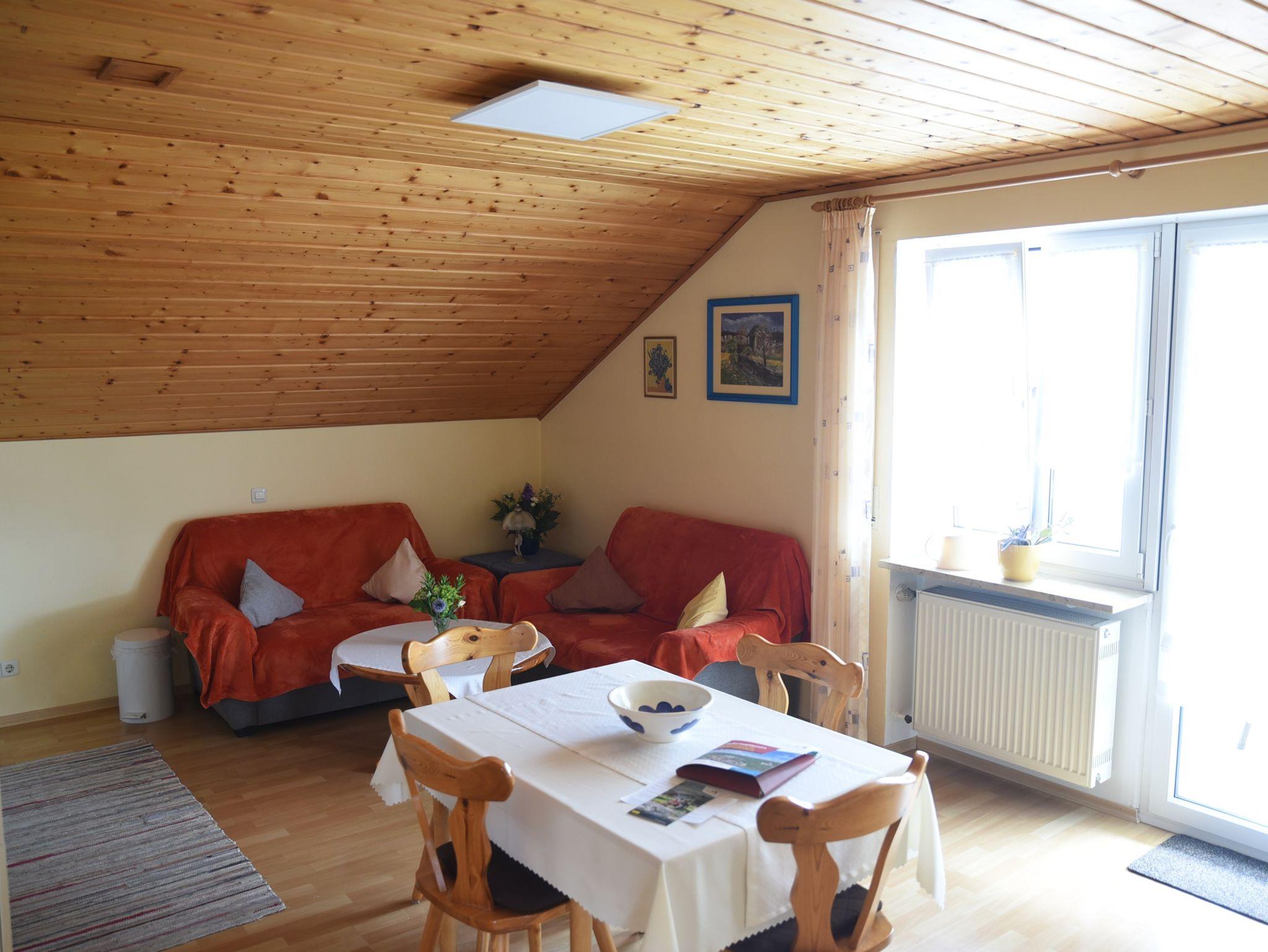 Die Ferienwohnung mit 80qm im Dachgeschoss mit Dachschrägen verfügt über 3 Schlafzimmer mit 1 Doppelbett und 2 Einzelbetten. In der Wohnküche befinden sich zwei Sofas und ein Fernseher. Die Küchenzeile ist mit Herd, Mikrowelle, Kühlschrank inkl. Gefrierfach, Wasserkocher, Toaster und Kaffeemaschine ausgestattet. Das Tageslicht-Badezimmer verfügt über Dusche/WC und einen Föhn. Zudem können Sie es sich auf unserem Balkon mit einem schönen Ausblick auf den Michelsberg gemütlich machen. Den Parkplatz am Haus können Sie kostenfrei nutzen.