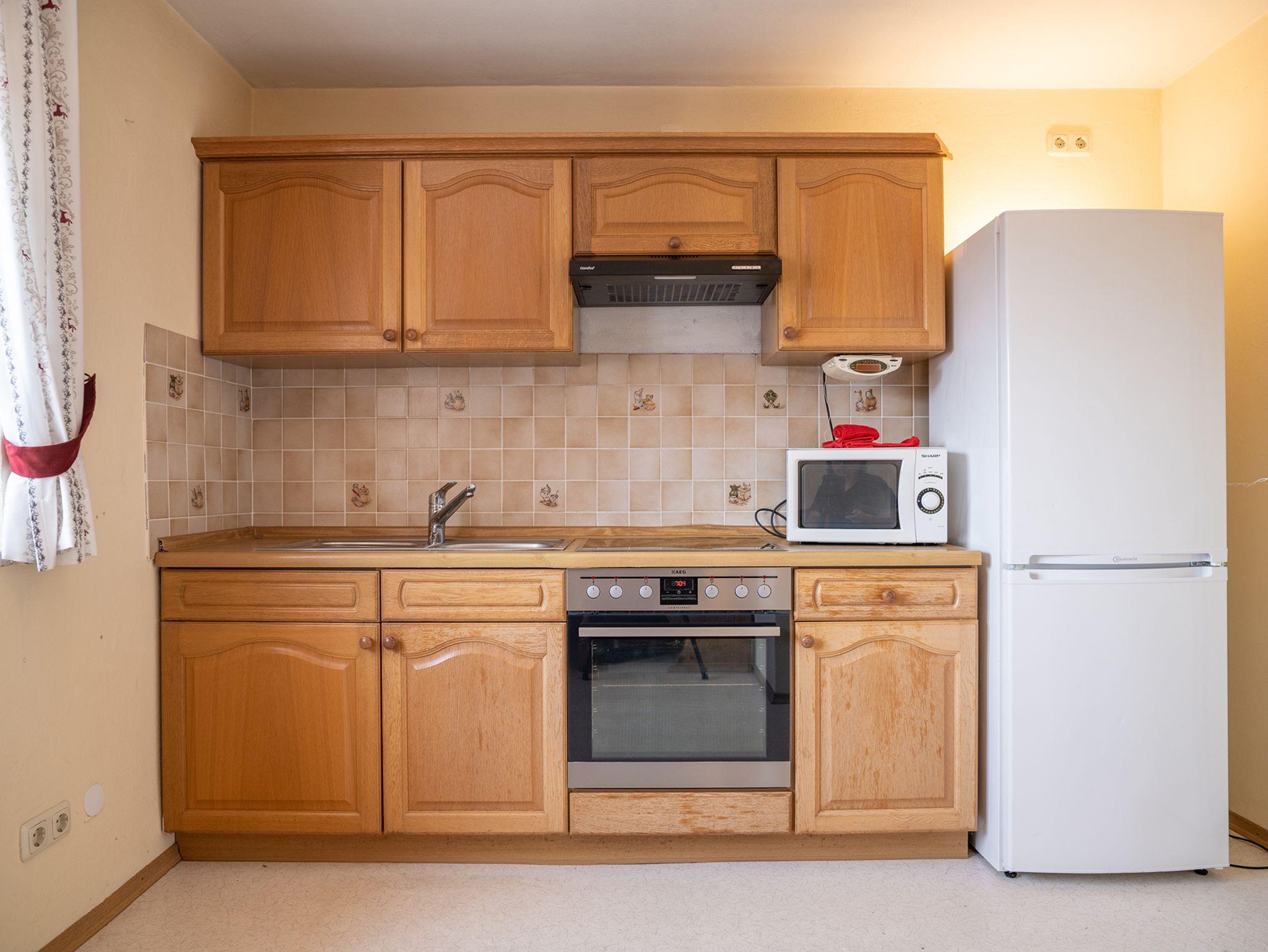 Die Wohnküche ist komplett ausgestattet – mit Backofen, Mikrowelle, Wasserkocher, Kaffeemaschine, Eierkocher und vielem mehr. Am Esstisch ist genug Platz für gemeinsame Mahlzeiten.