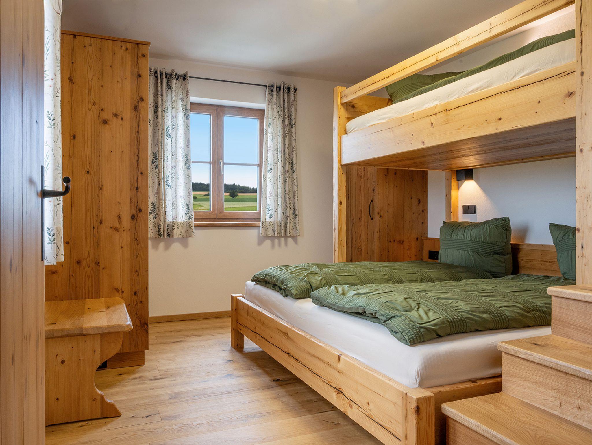 Unsere großzügige Ferienwohnung bietet viel Platz für Familien oder Paare: Ein Schlafzimmer (13,6?m²) mit großem Doppelbett und ein Schlafzimmer (ebenfalls 13,6?m²) mit Doppelbett und darüber quer 1 Einzelbett (über Treppe erreichbar) sorgen für erholsamen Schlaf.