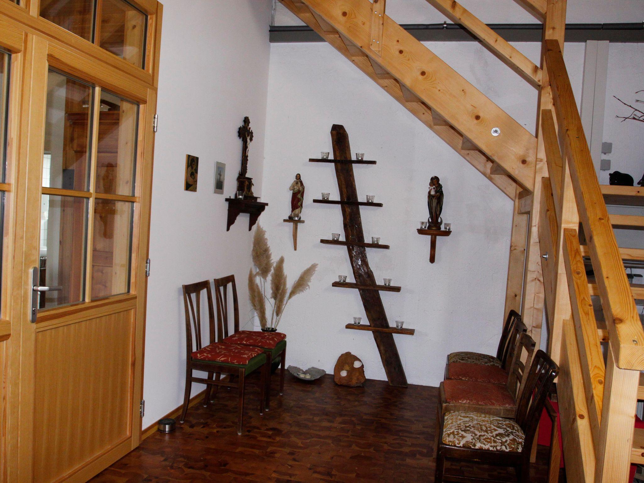Im Bereich des ehemaligen Pferdestalls befinden sich ein gemütlicher Aufenthaltsraum mit Pelletofen, ein Bad und eine vollausgestattete Küche für die Selbstversorgung. Von der Küche aus hat man einen Zugang zur schönen Holzterasse mit Aussicht ins Grüne.
