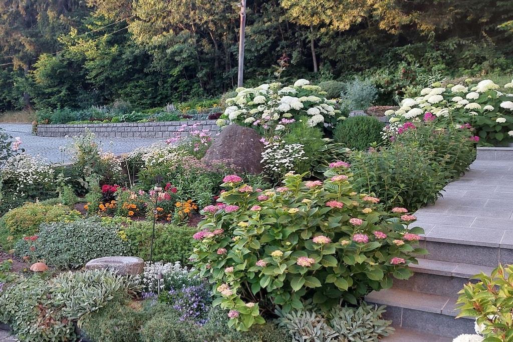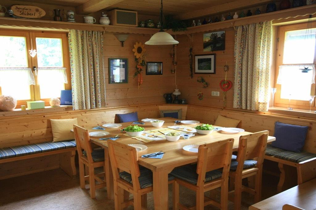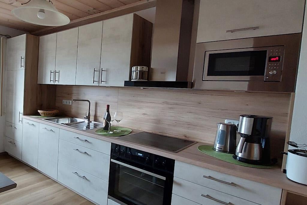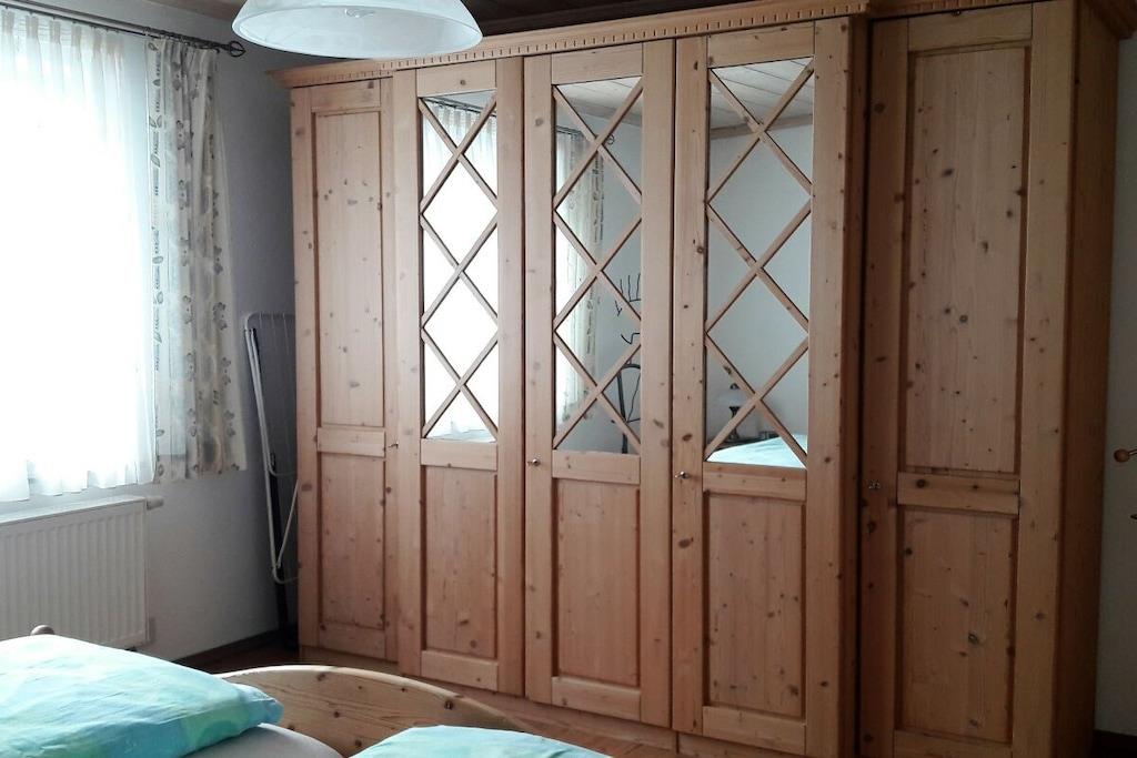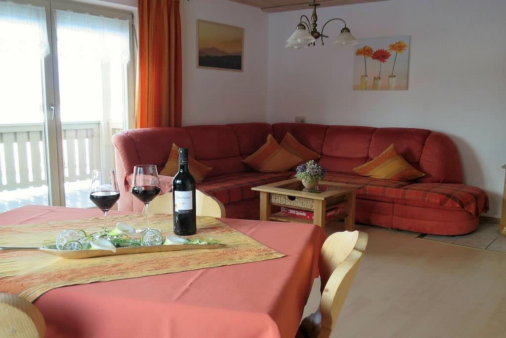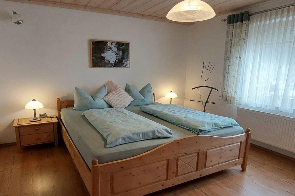 Vores feriehus med to 4-stjernede ferielejligheder og et dobbeltværelse ligger lige i skovbrynet med uhindret udsigt i ferieområdet Bayerischer Wald Nationalpark. Der er parkering lige ved siden af huset, og du kan komme til lejligheden derfra i stueetagen. Lejligheden er veludstyret og tilbyder mange faciliteter. Køkkenet er helt nyt, komfortabelt og veludstyret. Madrasserne i begge soveværelser er også nye og af høj kvalitet. Spiseområdet og den store sofa i stuen tilbyder masser af plads til fire personer. Denne lejlighed har to balkoner med siddepladser. Der er også et badeværelse/bruser/toilet og et andet separat toilet.