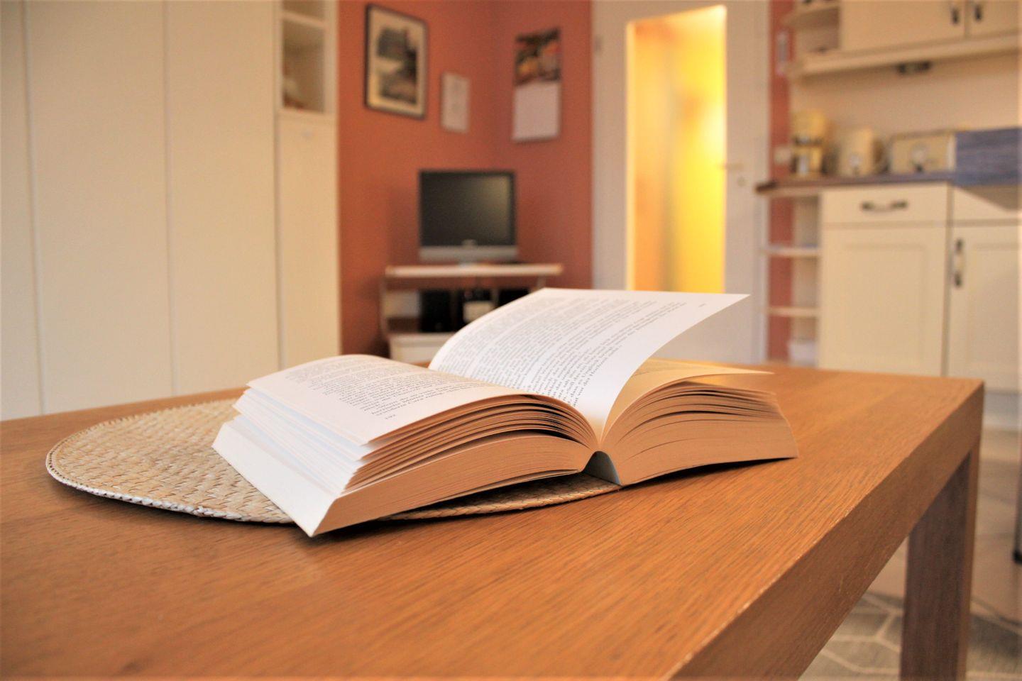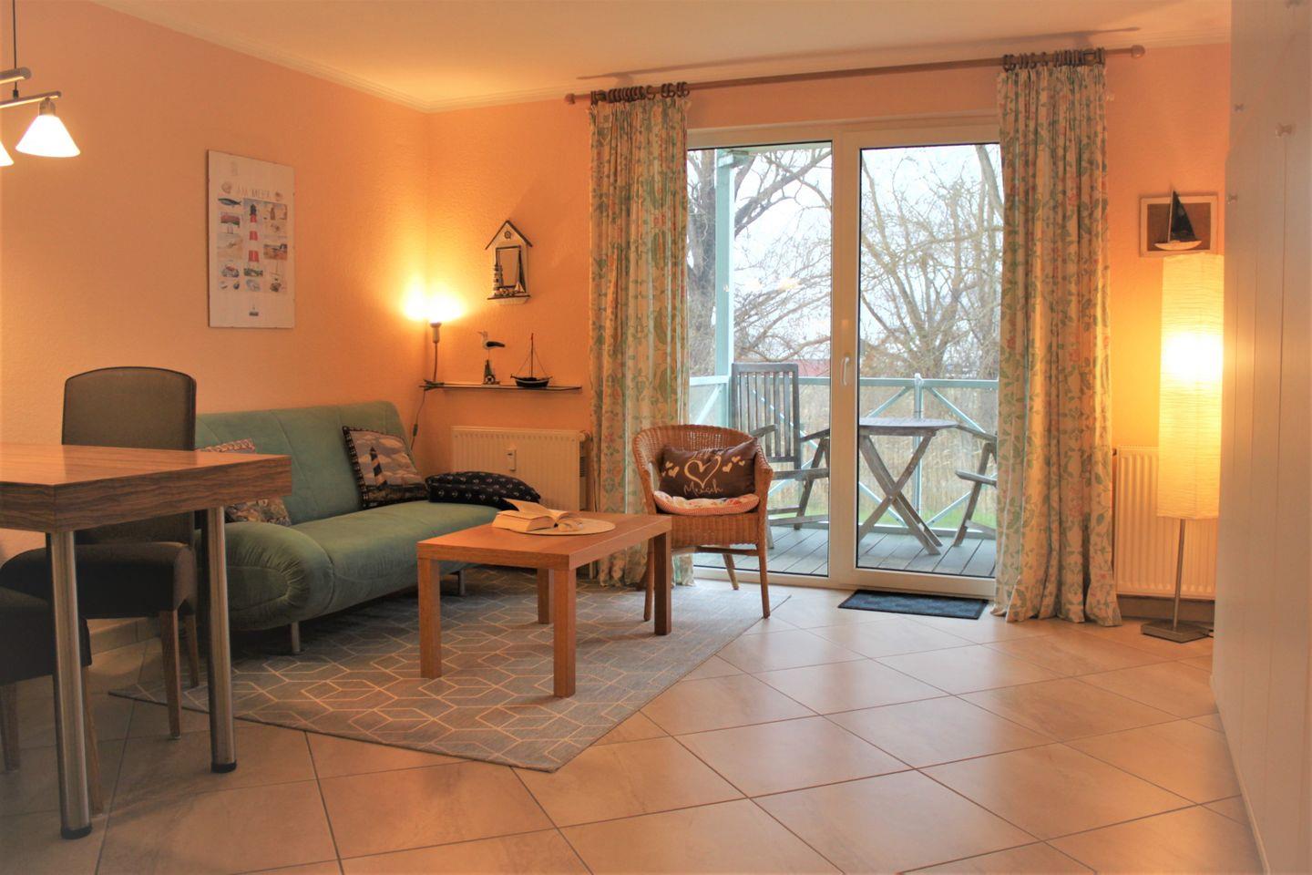 Tagsüber verfügen Sie über ein helles und freundlich eingerichtetes kombiniertes Wohn- und Esszimmer mit Zugang zum möblierten Balkon. Von hier genießen Sie einen schönen Blick über die umliegende Natur. Sie verfügen über ein gemütliches Sofa, ein TV-Gerät, eine Musikanlage, einen Schrank und einen Esstisch. Die integrierte Küche im Landhausstil ist unter anderem mit einem Kühlschrank mit Gefrierschrank, einem Herd, einem Backofen, Geschirrspülmaschine und Wasserkocher ausgestattet und lädt zu entspannten Kochabenden ein.