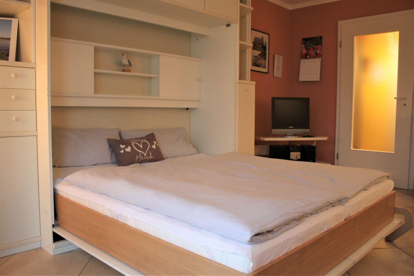 Für eine erholsame Nachtruhe steht Ihnen ein Doppelbett, welches tagsüber zu einem Schrank zusammengeklappt ist, zur Verfügung. Das moderne Badezimmer mit Dusche, Waschtisch, Föhn, Handtuchheizkörper und WC runden die Einrichtung dieses Appartements ab.