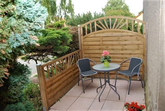 Zur Ferienwohnung gehört außerdem eine möblierte Terrasse und ein Parkplatz direkt vor dem Haus.