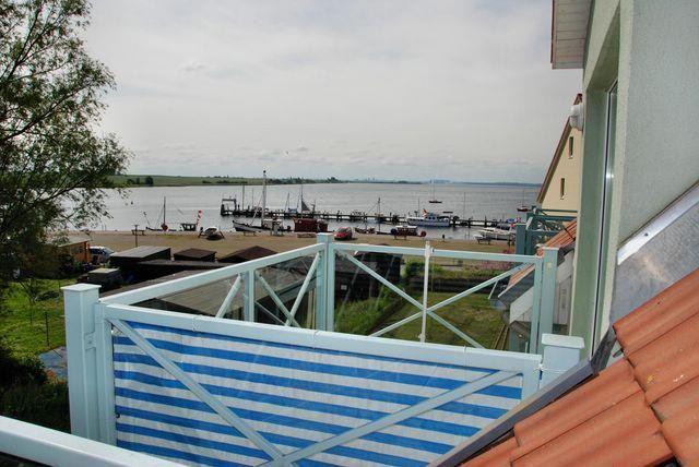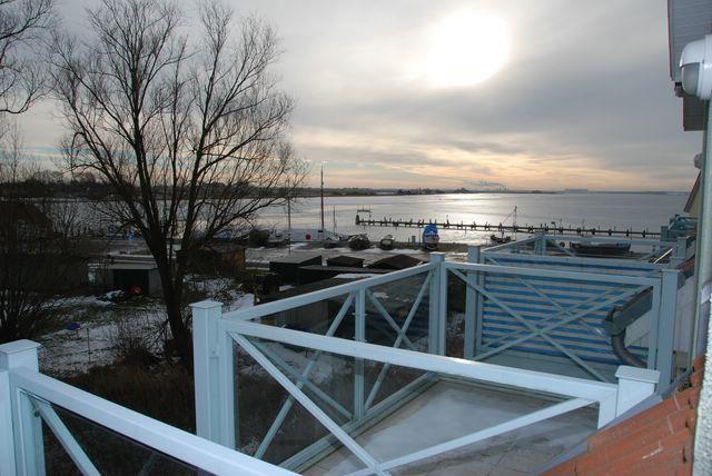 Das helle Wohn- und Esszimmer bietet Ihnen eine bequeme Sofaecke mit TV-Gerät und Zugang zum möblierten Balkon. Von hier haben Sie einen seitlichen Blick auf die Kirchsee und die Wismarbucht und können entspannte Stunden verbringen.