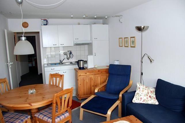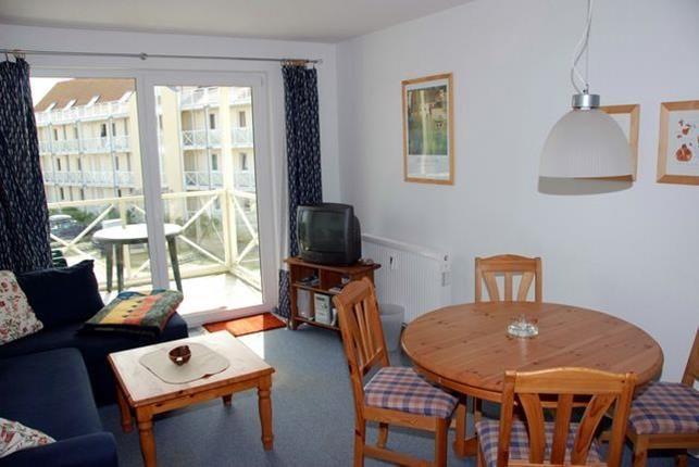 Das Wohnzimmer ist hell und offen gestaltet und mit einer Sofaecke, TV-Gerät und einem Essbereich sowie Küchenzeile ausgestattet. Außerdem befindet sich hier der Zugang zum möblierten Balkon mit seitlichem Blick auf den Hafen.