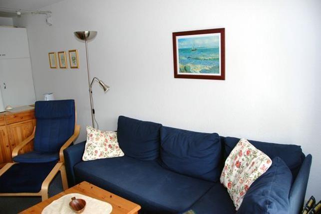 Das separate Schlafzimmer ist mit einem Doppelbett und einem Kleiderschrank möbliert und im Badezimmer stehen Ihnen eine Dusche, Waschtisch und WC zur Verfügung.