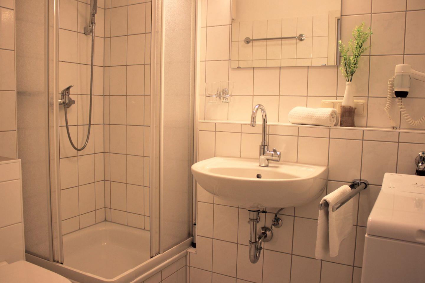Das helle Schlafzimmer bietet Ihnen ein Doppelbett und einen Kleiderschrank für Ihre Garderobe und das Badezimmer ist mit einer Dusche, einem Waschtisch, einem Föhn, einem WC und einer Waschmaschine ausgestattet.