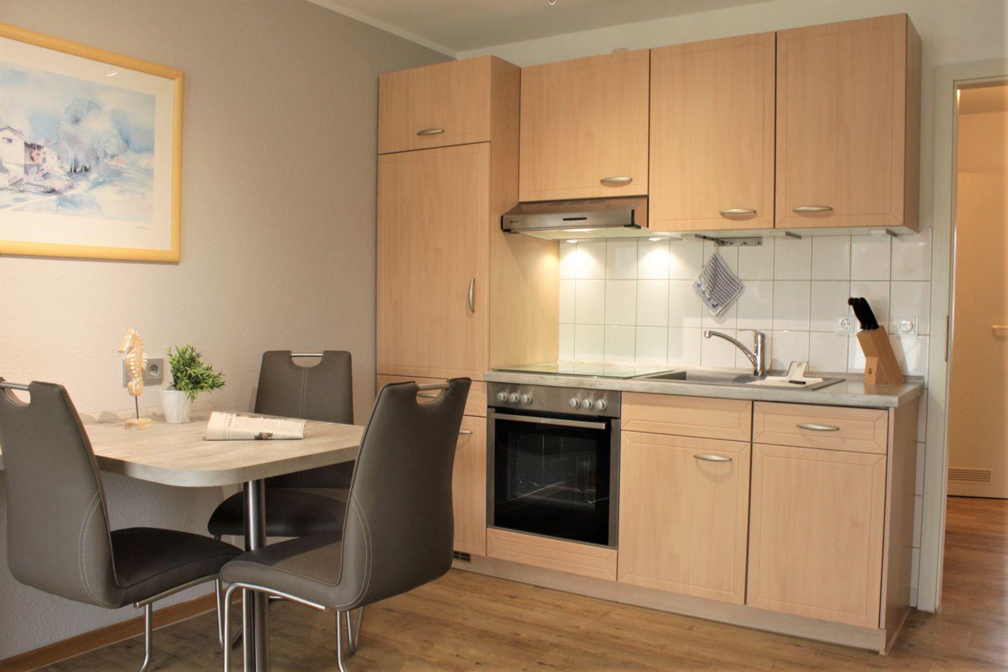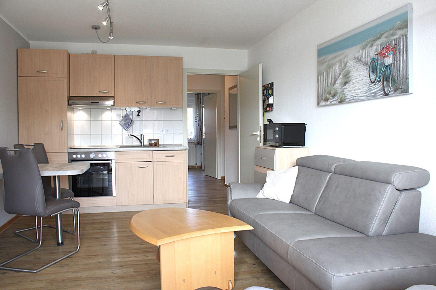 Die Küche ist in den Raum integriert und unter anderem mit Kühlschrank mit Gefrierfach, Herd mit Backofen, Mikrowelle, Kaffeemaschine, Wasserkocher und vielem mehr ausgestattet.