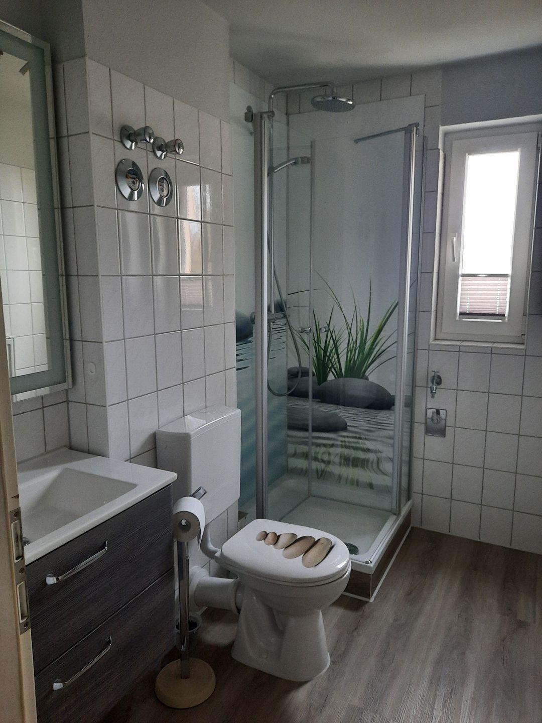 Das Badezimmer mit Fenster bietet Ihnen eine Dusche, einen Waschtisch und ein WC.