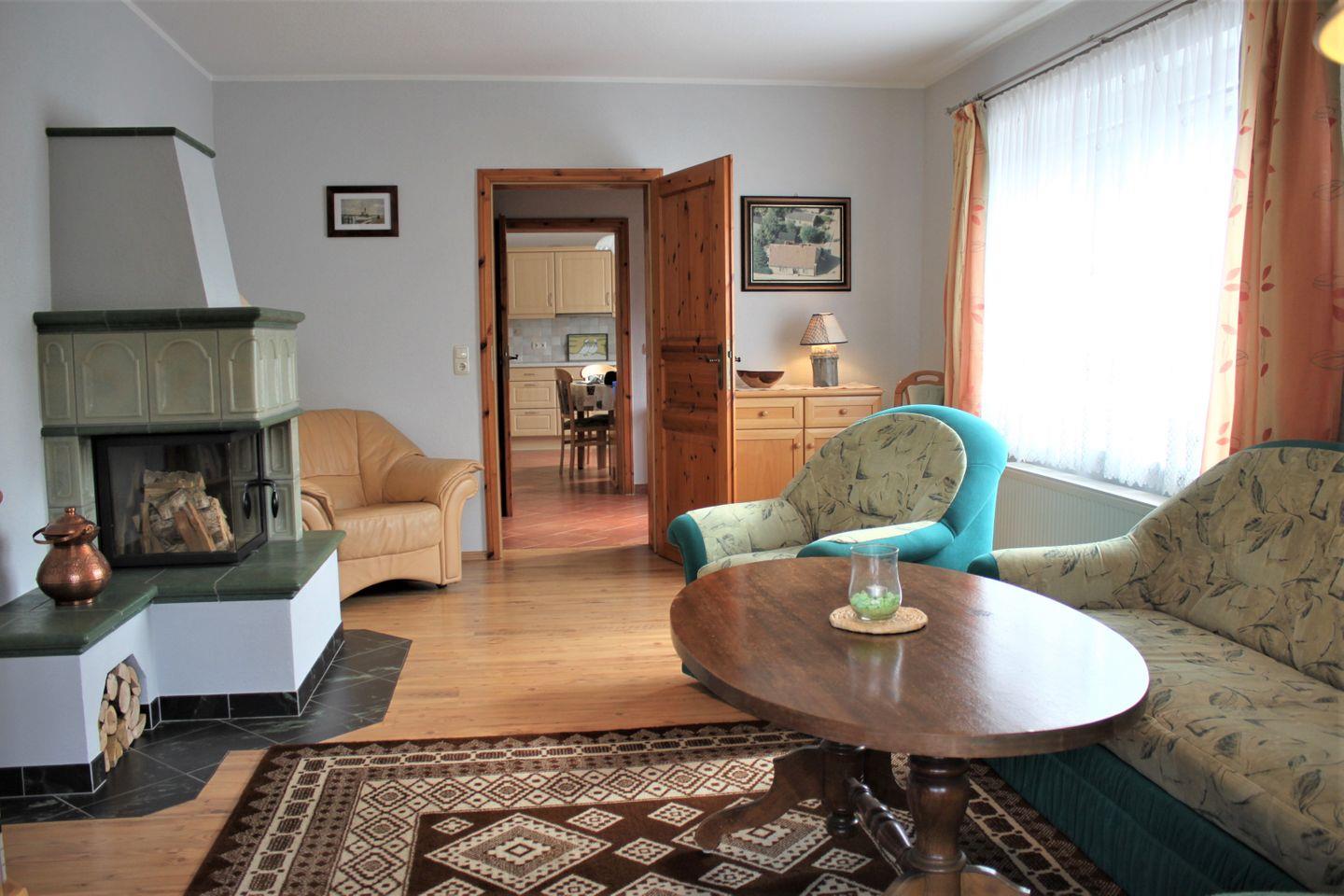 Das großzügige Wohnzimmer ist mit einem gemütlichen Sofa, einem TV-Gerät, Kamin und Zugang zur möblierten Terrasse ausgestattet. Hier verbringen Sie entspannte Stunden im Strandkorb mit Blick auf den angrenzenden kleinen Garten.