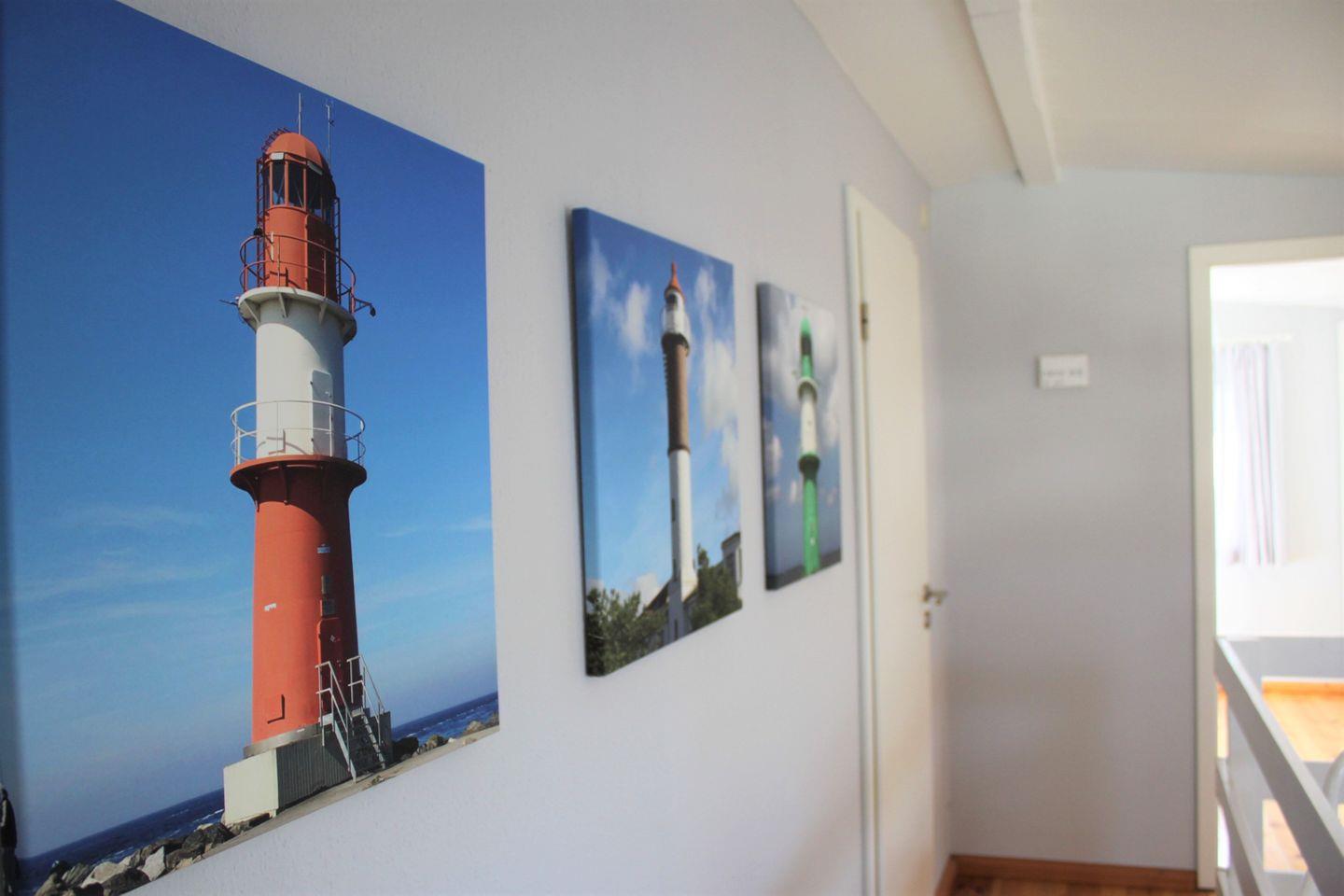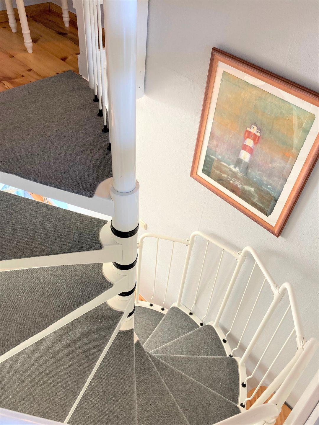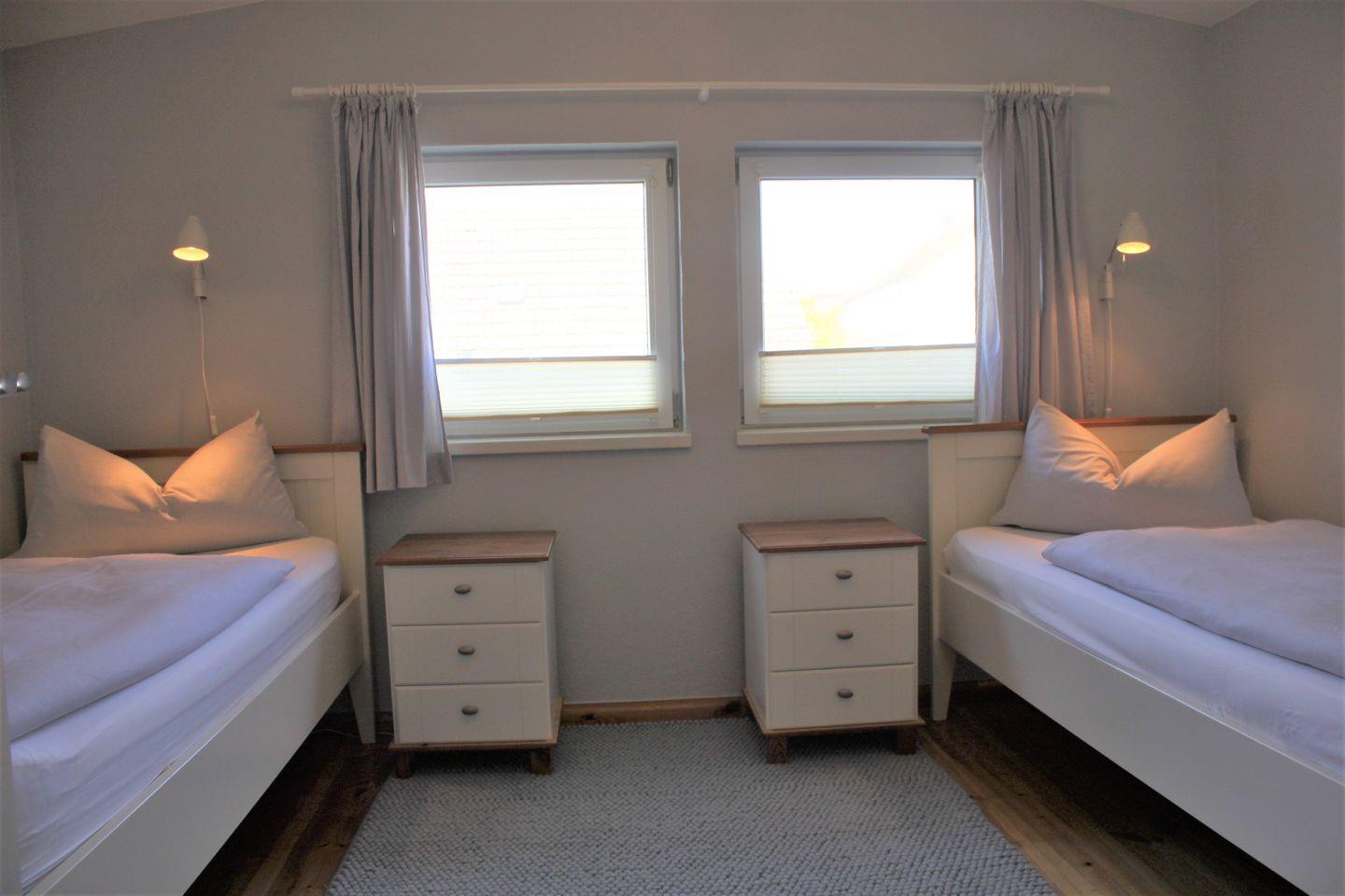 Über eine Wendeltreppe gelangen Sie in die obere Etage des Ferienhauses. Hier befinden sich die beiden separaten Schlafzimmer, die entweder mit einem Doppelbett (160x200cm mit durchgängiger Matratze) oder einem Einzelbett und jeweils genügend Stauraum für Ihre Garderobe möbliert sind.