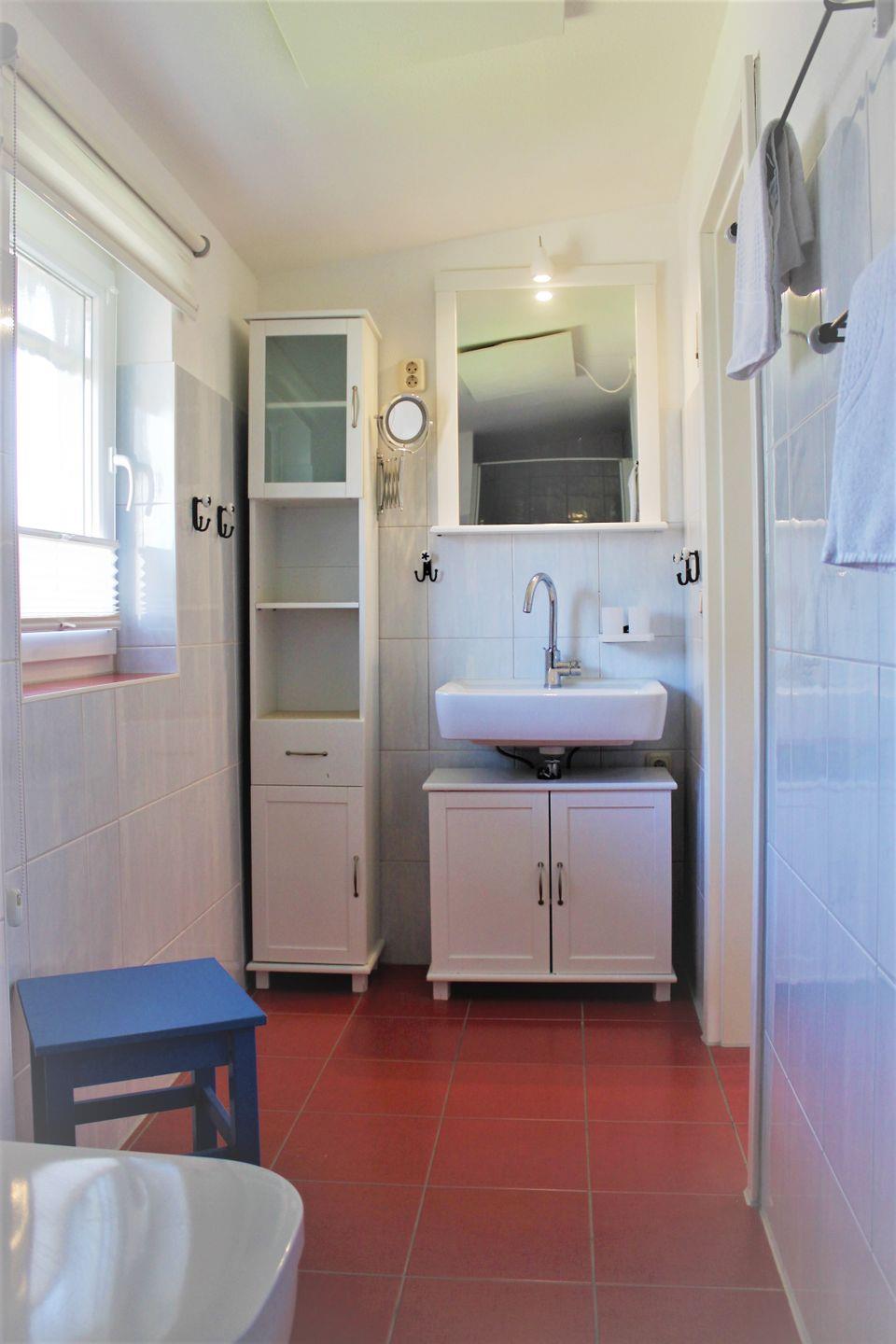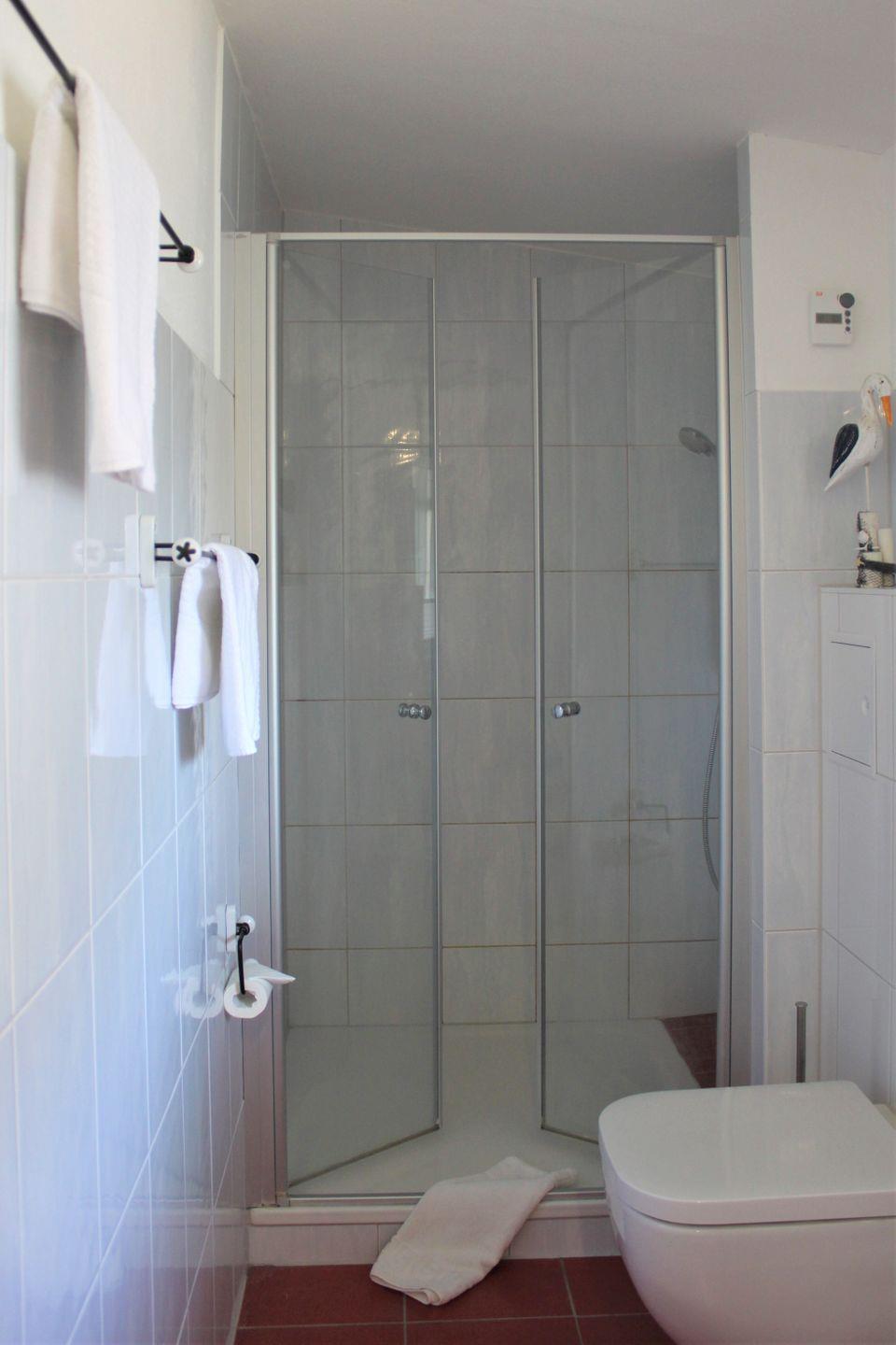 Das Badezimmer mit Fenster verfügt über eine Dusche, einen Waschtisch und ein WC.