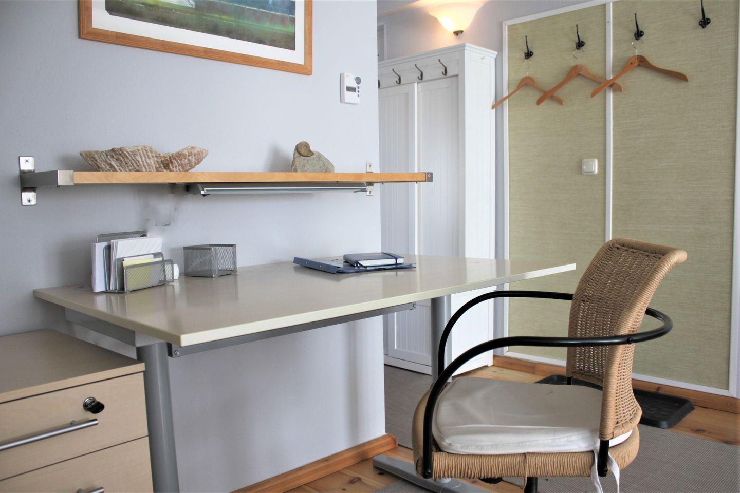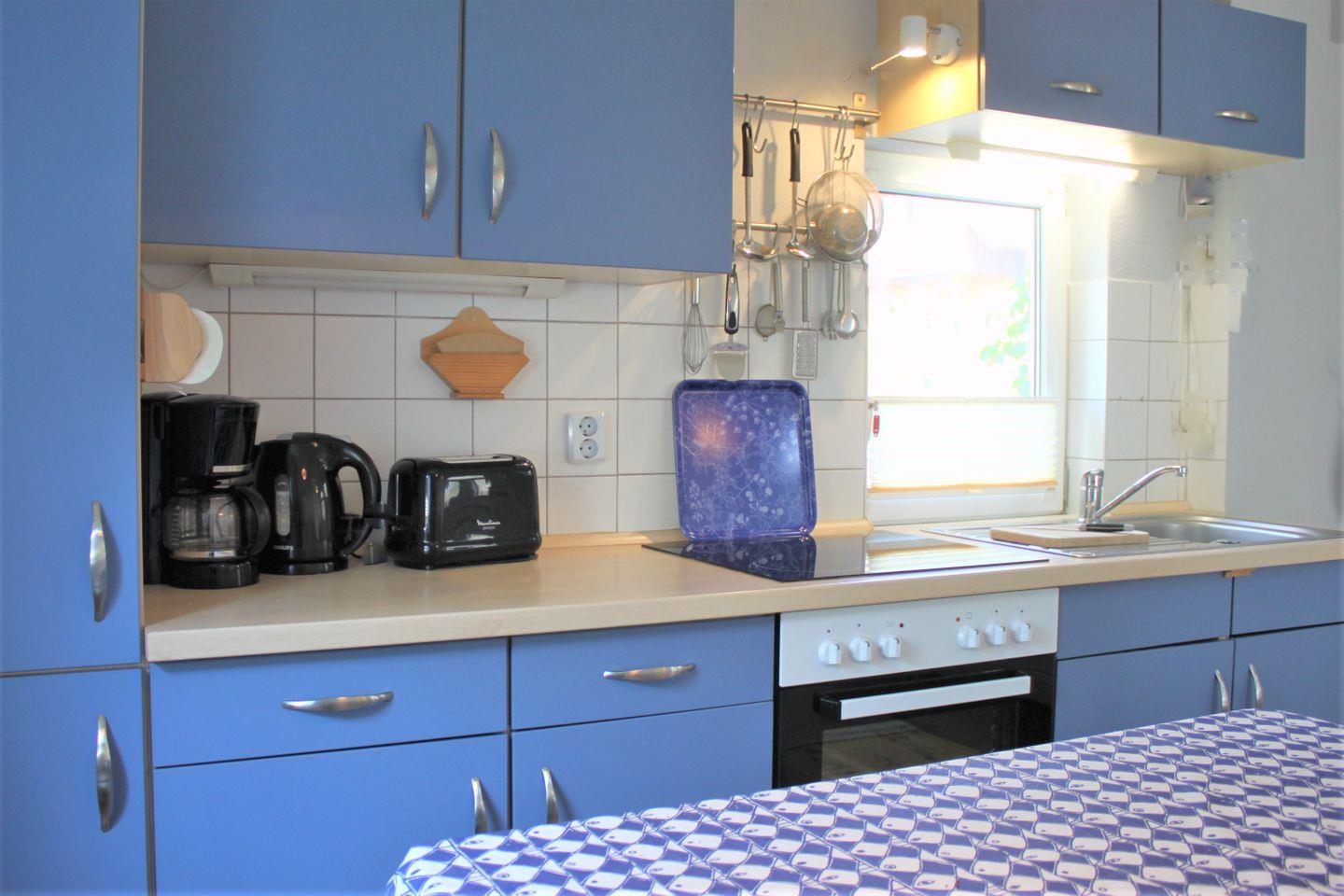 In der modernen Küche verfügen Sie über alle technischen Geräte, die Sie für eine Selbstversorgung benötigen. Dazu gehören z.B. ein Herd mit Backofen, einen Kühlschrank mit Gefrierfach, eine Kaffeemaschine, Wasserkocher und vieles mehr. Am angrenzenden Esstisch mit gemütlicher Sitzbank können Sie Ihre Mahlzeiten einnehmen.
