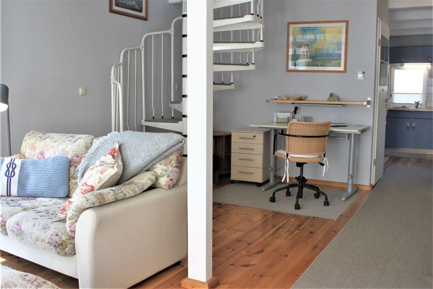 Der helle Wohnbereich ist mit einer gemütlichen Sofaecke mit TV-Gerät, WLAN (Gigacube - nur begrenzt verfügbar), einer kleinen Auswahl an Büchern und einem Schreibtisch ausgestattet. Außerdem befindet sich hier der Zugang zu der möblierten Terrasse mit Blick in die umliegende Natur.