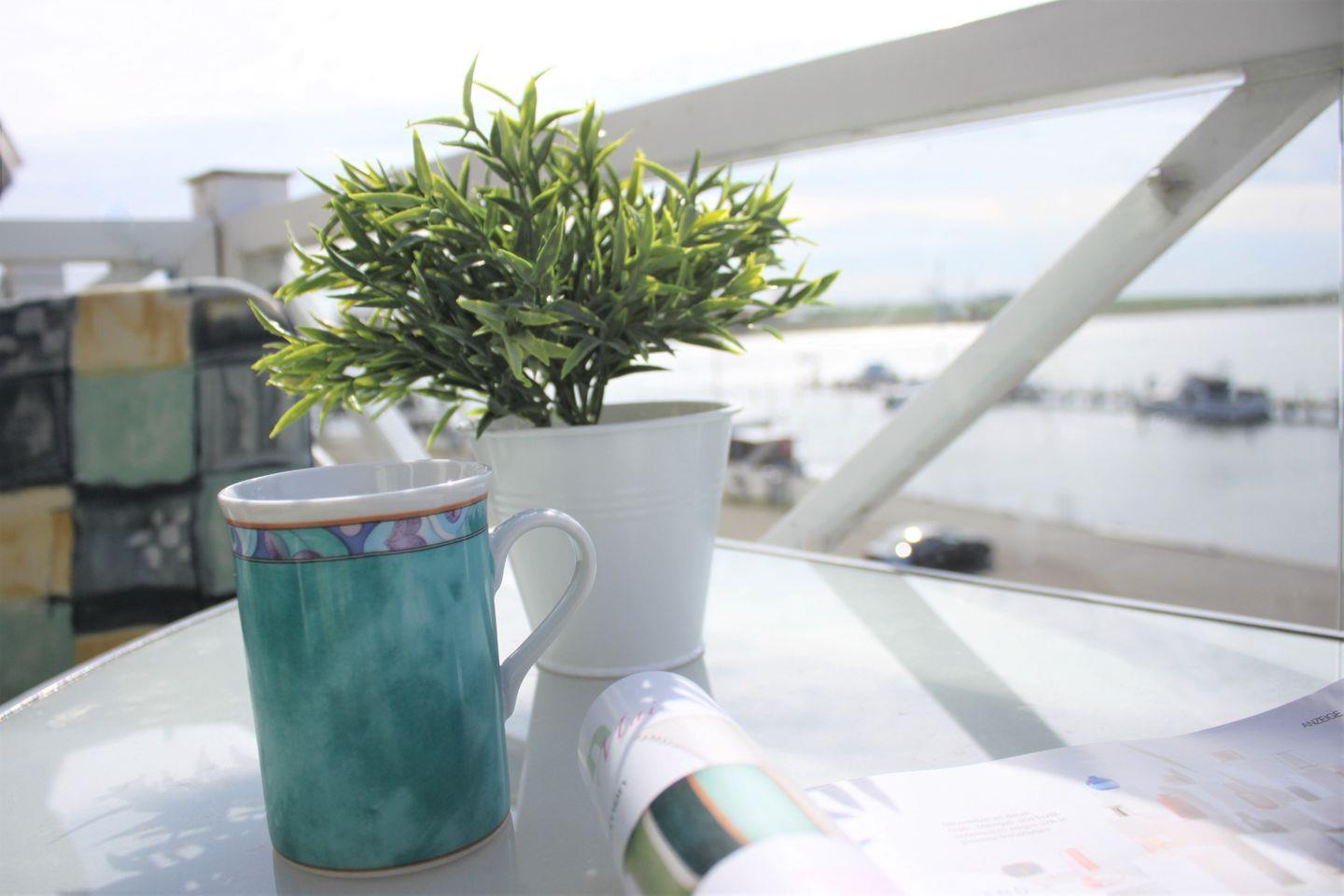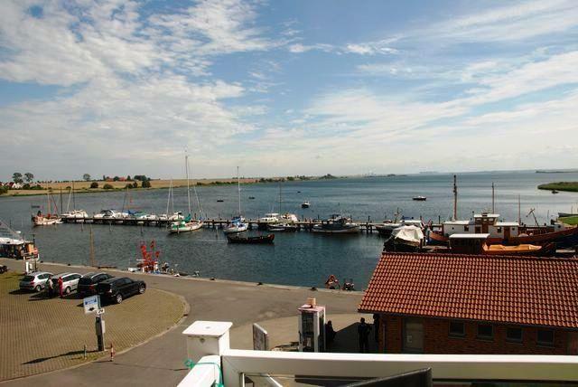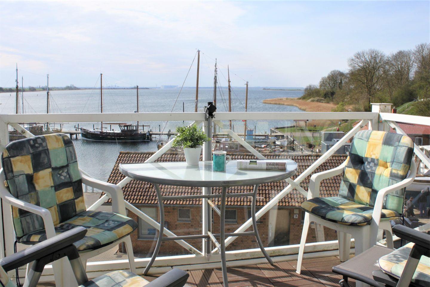 Das geräumige Wohn-/Esszimmer bietet Ihnen eine Sofaecke mit TV-Gerät, WLAN, einen Esstisch und Zugang zum möblierten Balkon mit unverbaubarem Blick auf die Kirchsee und die Wismarbucht.