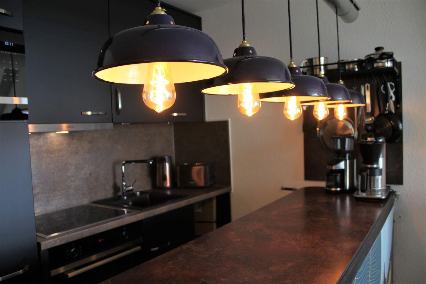 Die integrierte Küche ist voll ausgestattet und verfügt unter anderem über einen Kühlschrank mit Gefrierfach, einen Herd mit Backofen, eine Geschirrspülmaschine, Kaffeemaschine, Wasserkocher und vieles mehr.