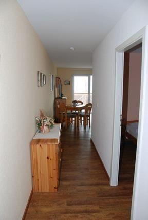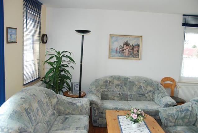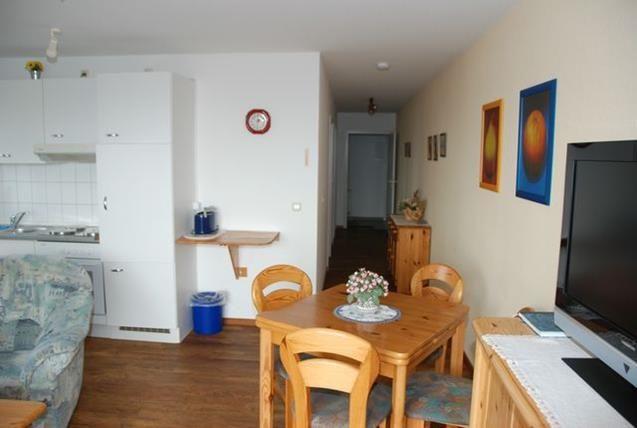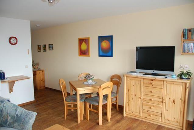 Der helle Wohn- und Essbereich ist kombiniert und verfügt über eine gemütliche Sofaecke mit TV-Gerät, einen Esstisch und Zugang zum möblierten Balkon in Südausrichtung. Hier haben Sie einen tollen Blick auf das bunte Treiben am Yachthafen von Kirchdorf und die Wismarbucht mit Kirchsee.