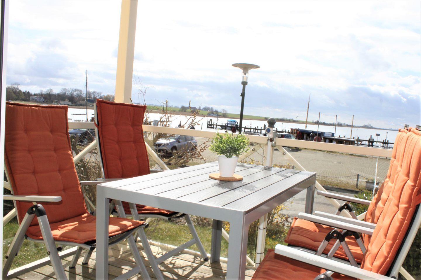 Der kombinierte Wohn- und Essbereich ist hell und modern möbliert und bietet Ihnen eine komfortable Sofaecke mit Relaxsessel, TV-Gerät, WLAN und Musikanlage für die gemütlichen Stunden des Tages. Außerdem befindet sich hier der Zugang zum möblierten ausgerichteten Balkon, von dem aus Sie einen schönen Blick über den Hafen, die Kirchsee und die Wismarbucht haben.