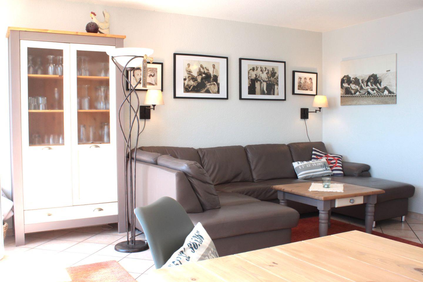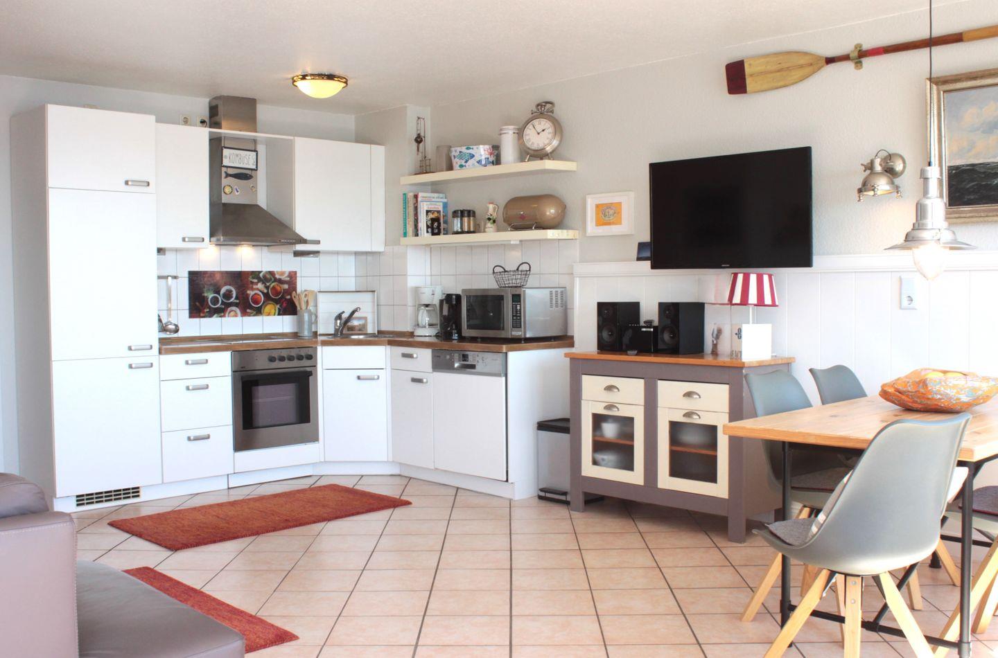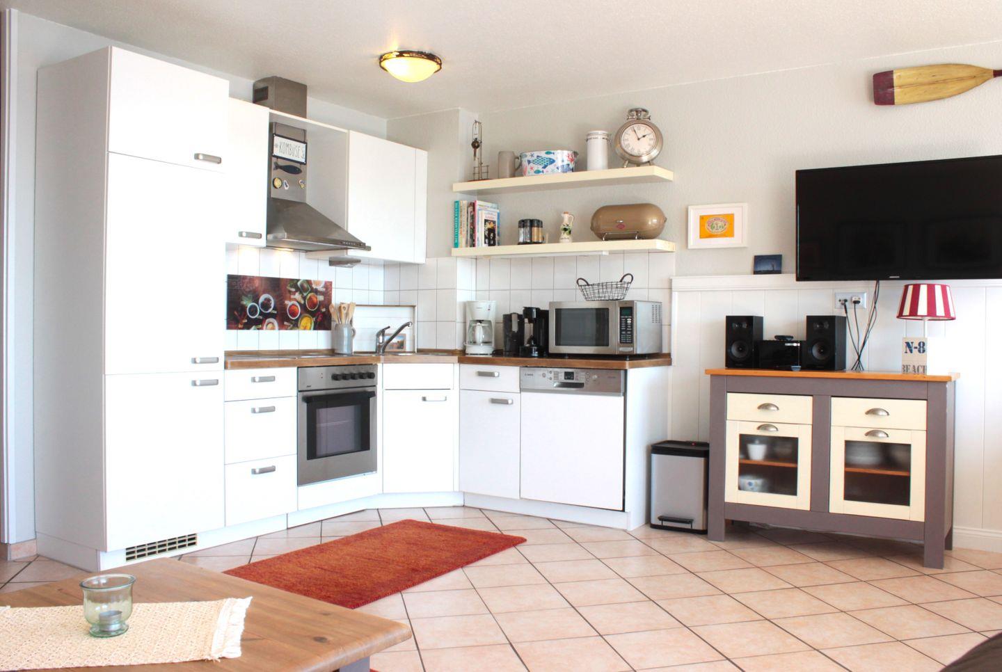 Die Wohnung bietet Ihnen über 2 Etagen viel Platz, Rückzugsmöglichkeiten und Gemütlichkeit. In der unteren Etage befindet sich neben dem gemütlichen Wohnzimmer auch das Badezimmer und ein Schlafzimmer mit Doppelstockbett. Die integrierte Küche im schönen Landhausstil verfügt unter anderem über einen Herd mit Backofen, eine Geschirrspülmaschine, einen Kühlschrank mit Gefrierfach und diverse Kleingeräte wie Kaffeemaschine, Wasserkocher und Toaster und lädt zu gemütlichen Kochabenden ein.