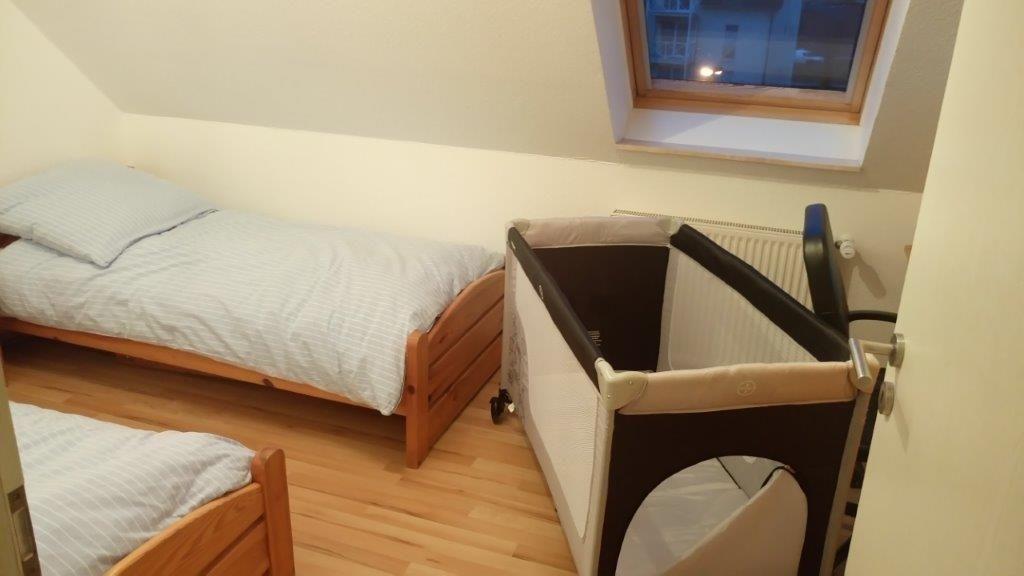 Die Wohnung verfügt über zwei separate Schlafzimmer. Ein Schlafzimmer ist mit einem Doppelbett, einem Kleiderschrank und einem TV-Gerät, das zweite mit zwei Einzelbetten, einem Kleiderschrank und einem Schreibtisch möbliert. Hier findet auch das Kinderreisebett, wenn benötigt, seinen Platz. Für zwei weitere Personen lassen sich die beiden Sofas im Wohnzimmer problemlos in zwei getrennte, großzügige Schlafmöglichkeiten verwandeln. Wir empfehlen die Nutzung der Doppelschlafcouchen für Kinder!