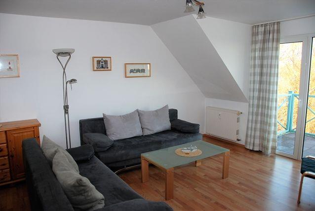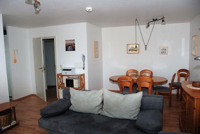 Der kombinierte Wohn- und Essbereich ist hell und komfortabel möbliert. Sie verfügen über eine Sofaecke mit TV-Gerät und DVD-Player, einen Multifunktionsdrucker und einen großzügigen Esstisch, an dem bequem 6 Personen Platz finden. Hier befindet sich außerdem der Zugang zum möblierten Balkon.