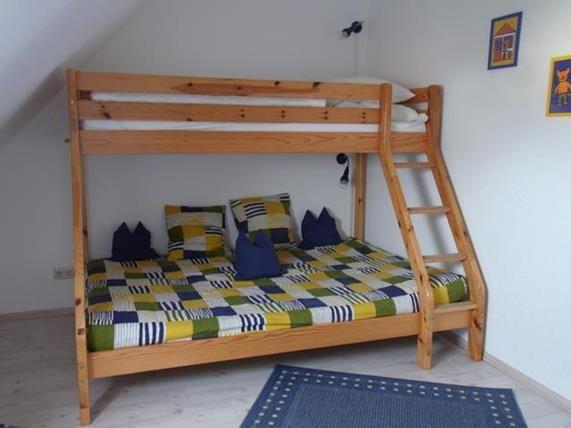 Ein Schlafzimmer verfügt über ein klassisches Doppelbett, das zweite Schlafzimmer über ein Etagenbett für drei Personen, die untere Liegefläche entspricht einem Doppelbett (1,40 m breit). Die Wohnung ist damit besonders für Familien mit bis zu drei Kindern geeignet.