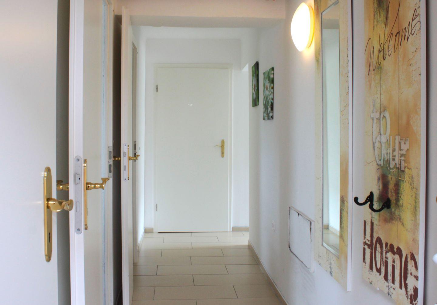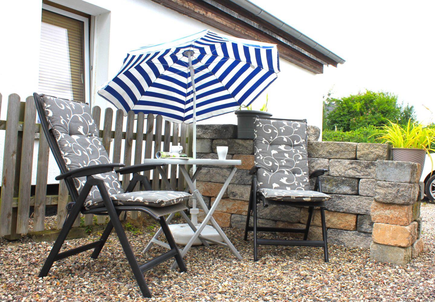 Ein kleine angrenzende Terrasse mit Tisch, Stühlen und Grill lädt zu entspannten Stunden ein. Ihren Pkw parken Sie kostenfrei auf dem dazugehörigen Parkplatz am Haus.