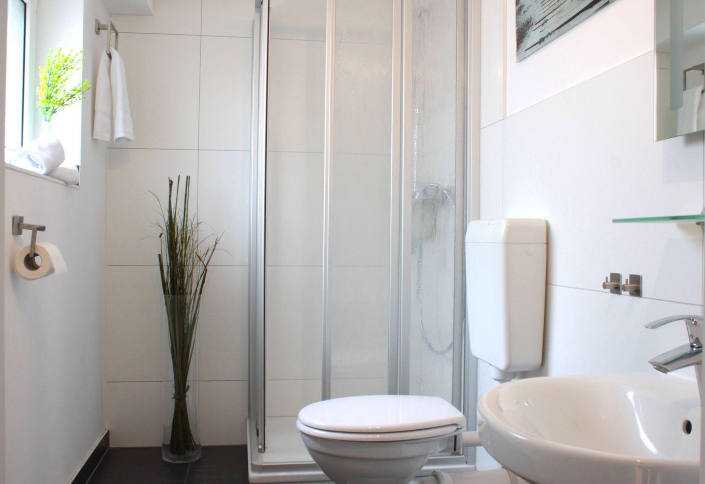 Das Badezimmer mit Fenster bietet eine Dusche, Waschtisch, Föhn und WC und ermöglicht einen guten Start in den Tag.