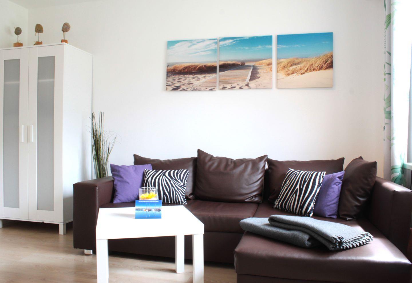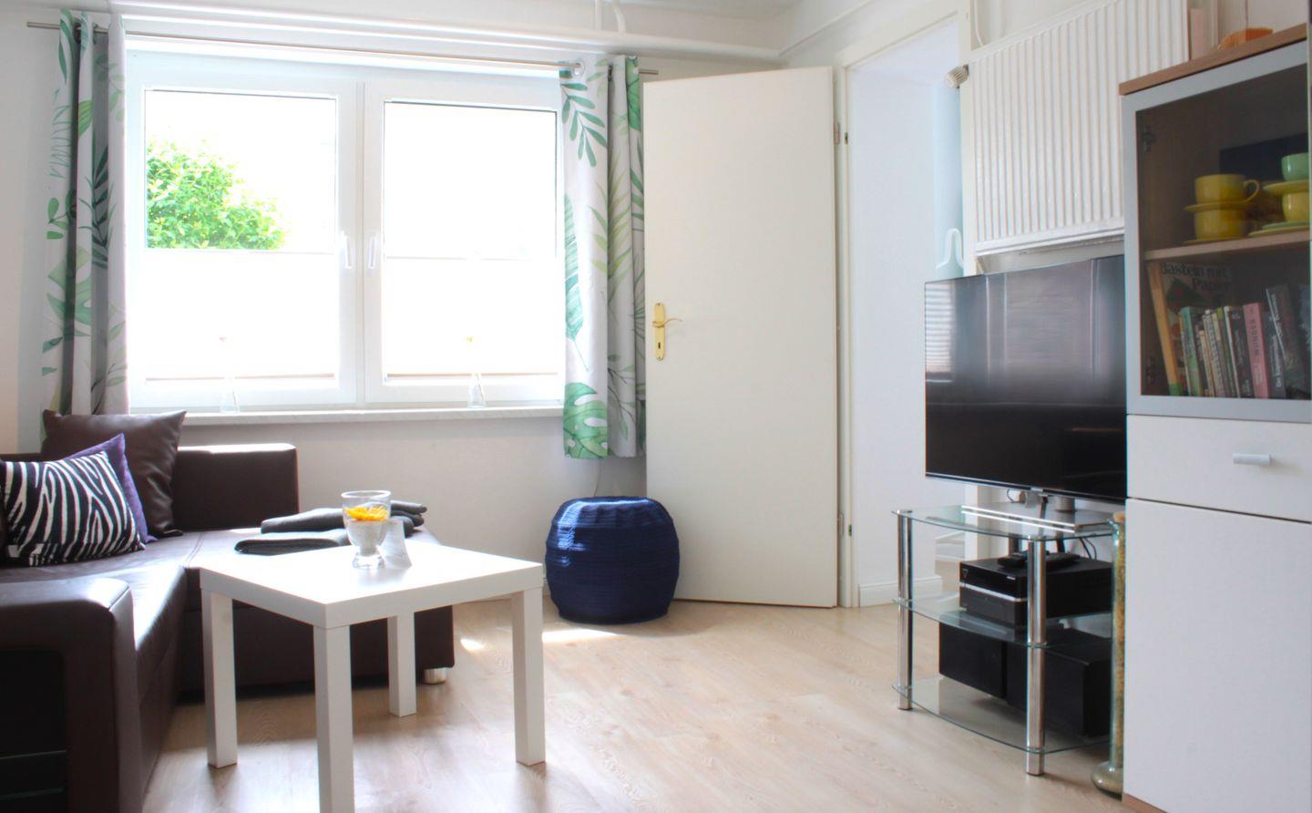 Das moderne Wohnzimmer verfügt über ein gemütliches Sofa, TV-Gerät, WLAN und Stauraum für Ihre Garderobe.