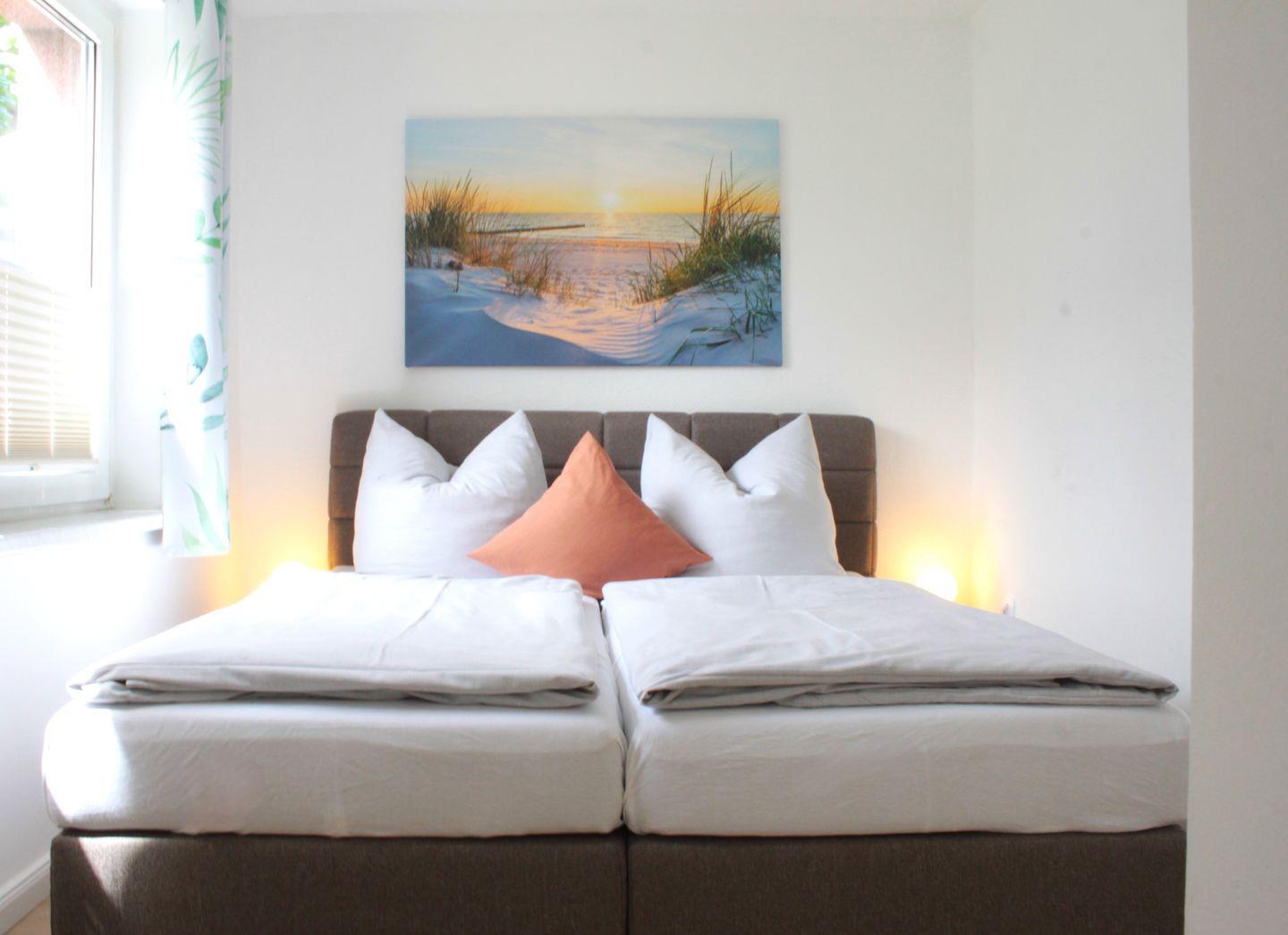 Das Schlafzimmer ist angrenzend und mit einem Doppelbett möbliert.