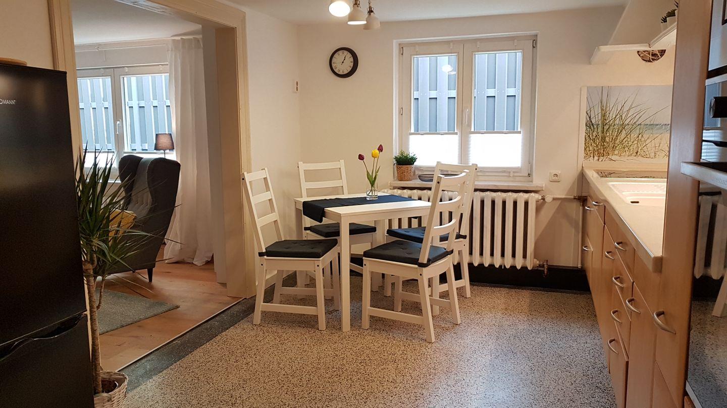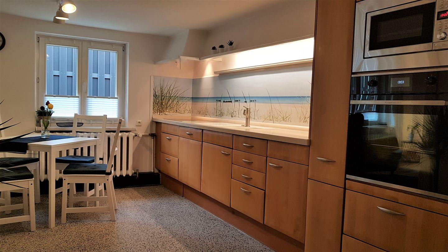 Über einen Flur mit originalem Terrazzoboden gelangen Sie in das gemütliche Wohnzimmer, welches offen zur Küche mit Essbereich gestaltet wurde. Ausgestattet mit Sofa, TV-Gerät und WLAN verbringen Sie hier gemütliche Stunden. Die hochwertige Küche ist zum Wohnbereich offen gehalten und mit allen technischen Geräten ausgestattet, die Sie für eine Selbstversorgung benötigen. Dazu gehören z.B. ein Geschirrspüler, eine Kühlschrank mit Gefrierfach, ein Herd, ein Backofen, Mikrowelle, Kaffeemaschine und vieles mehr.