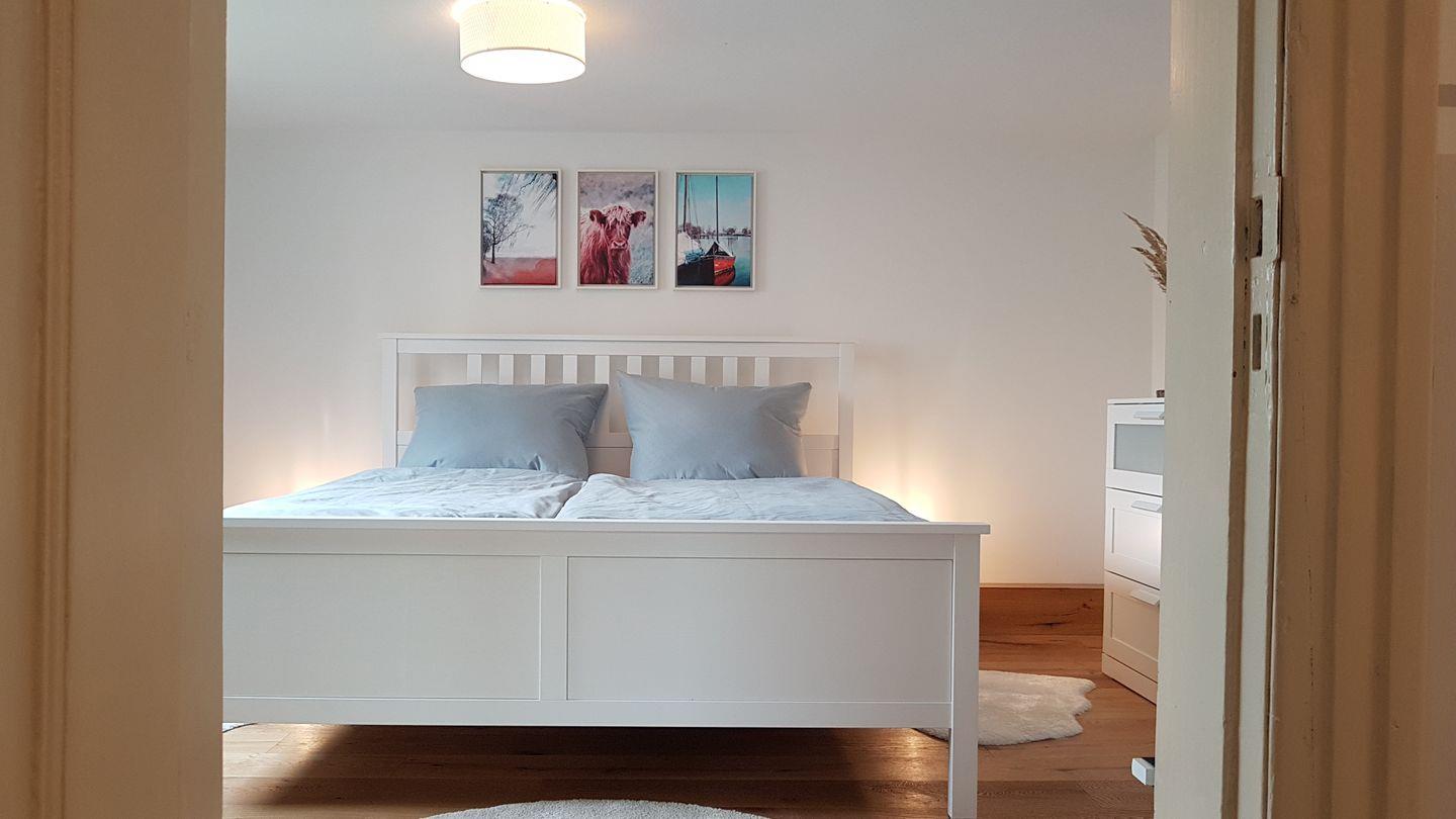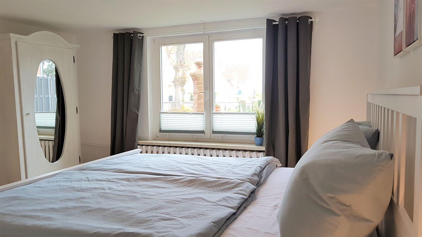 Im hellen, separaten Schlafzimmer (Fenster mit 3-fach Verglasung) verfügen Sie über ein komfortables Doppelbett (180 x 200cm mit durchgängiger Matratze) und genügend Stauraum für Ihre Garderobe.