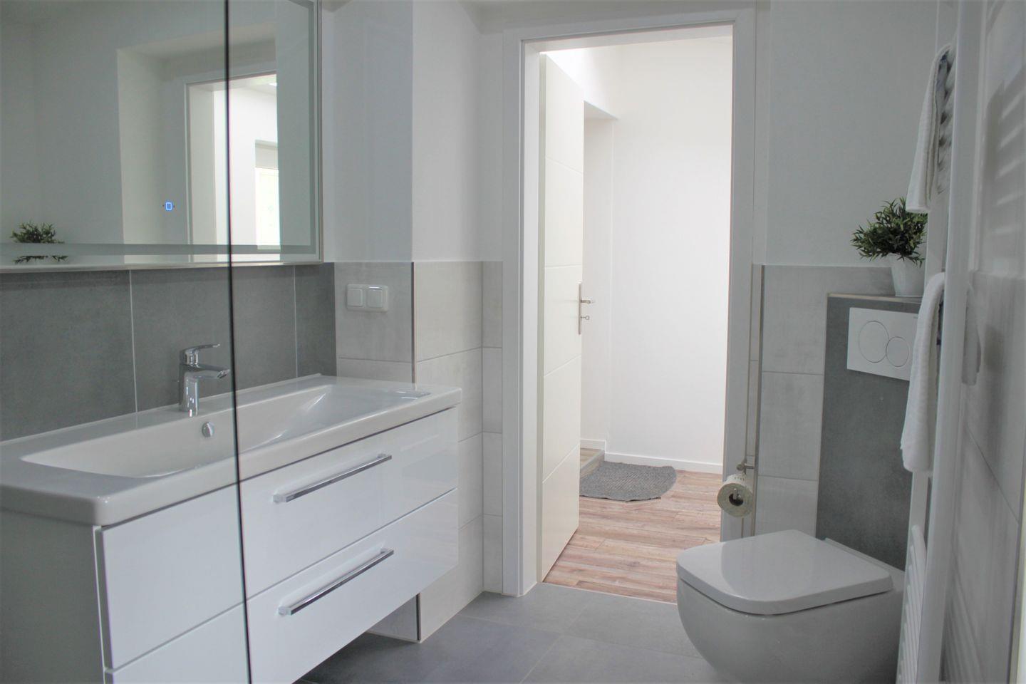 Das moderne Badezimmer verfügt über eine ebenerdige Dusche, einen großzügigen Waschtisch und ein WC.