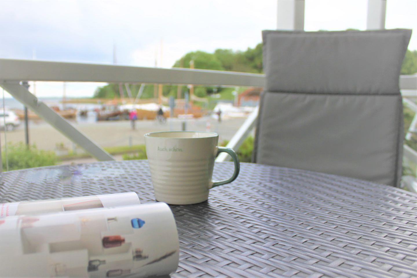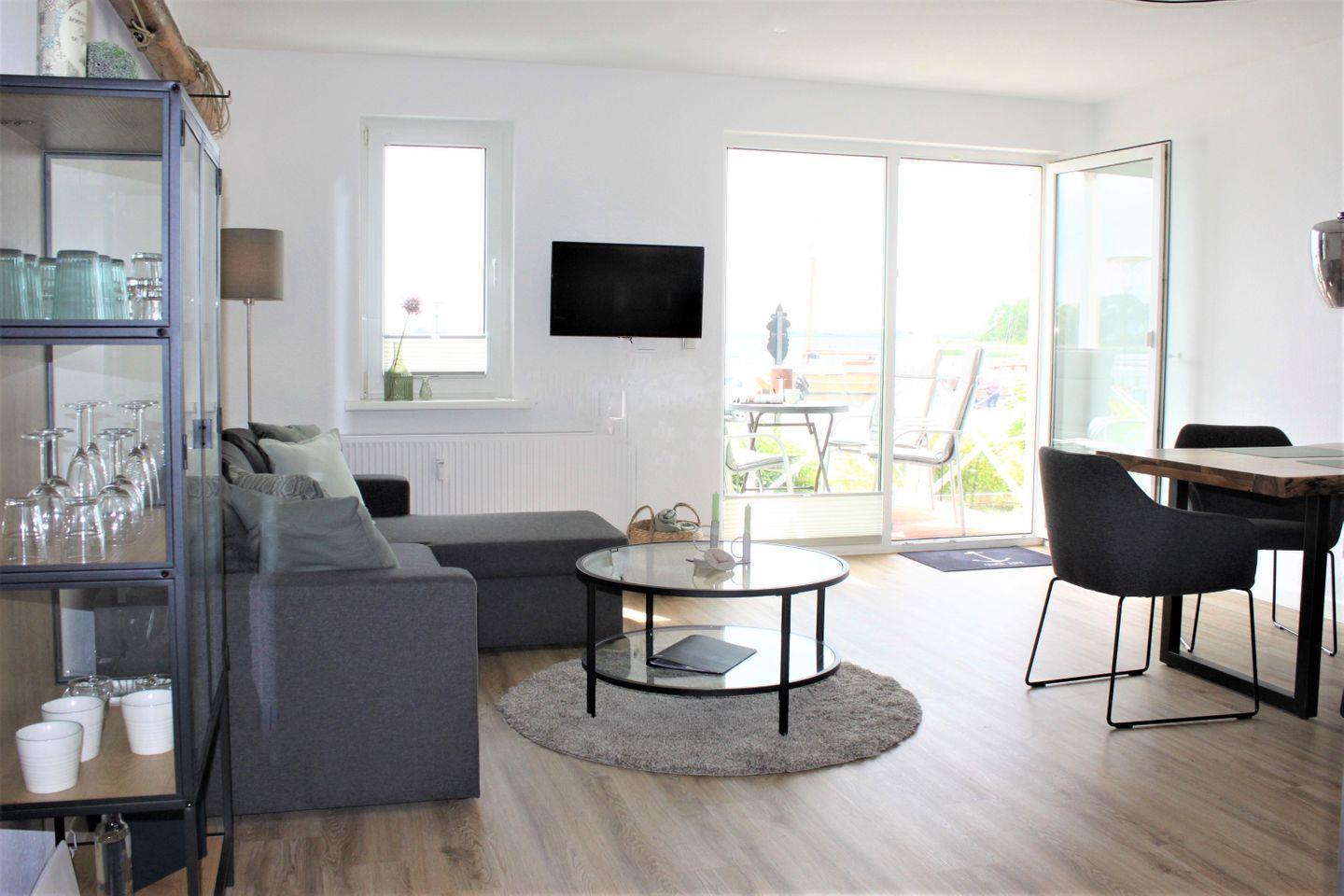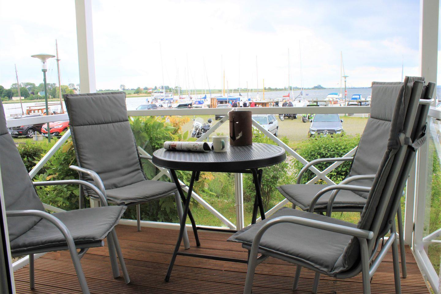 Der Zugang zum möblierten Balkon, von dem aus Sie einen traumhaften Blick auf den Yachthafen, die Wismarbucht und die Inselkirche haben, befindet sich ebenfalls im Wohn- und Esszimmer.