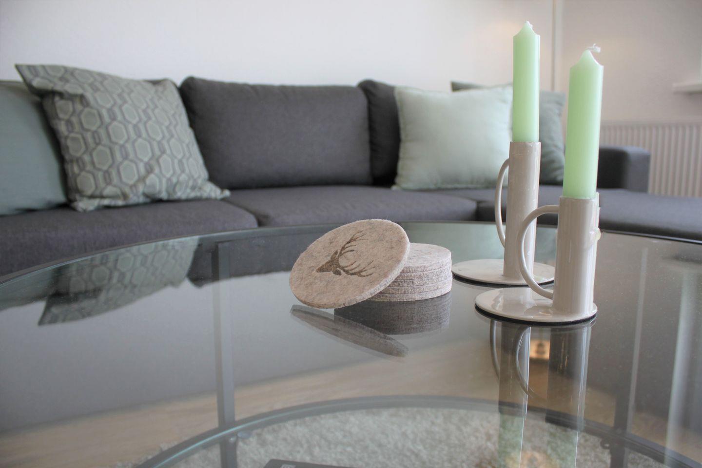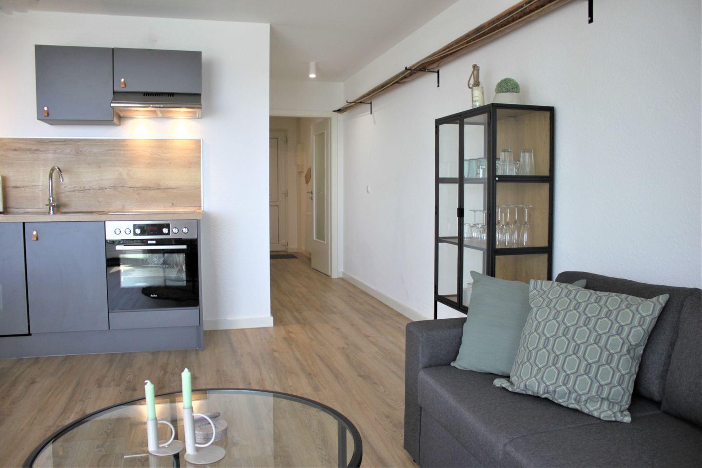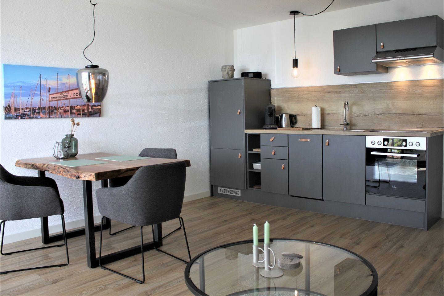 Der helle und mit Liebe zum Detail eingerichtete Wohn- und Essbereich ist kombiniert und verfügt über eine komfortable Sofaecke, ein TV-Gerät, WLAN und einen großzügigen Esstisch. Die hochwertige, moderne Küche ist in den Raum integriert und vollwertig ausgestattet. Dazu gehören z.B. ein Herd mit Backofen, ein Kühlschrank mit Gefrierfach, eine Geschirrspülmaschine, zwei Kaffeemaschinen (Filter und Senseo-Padmaschine), Wasserkocher, Toaster und einiges mehr.