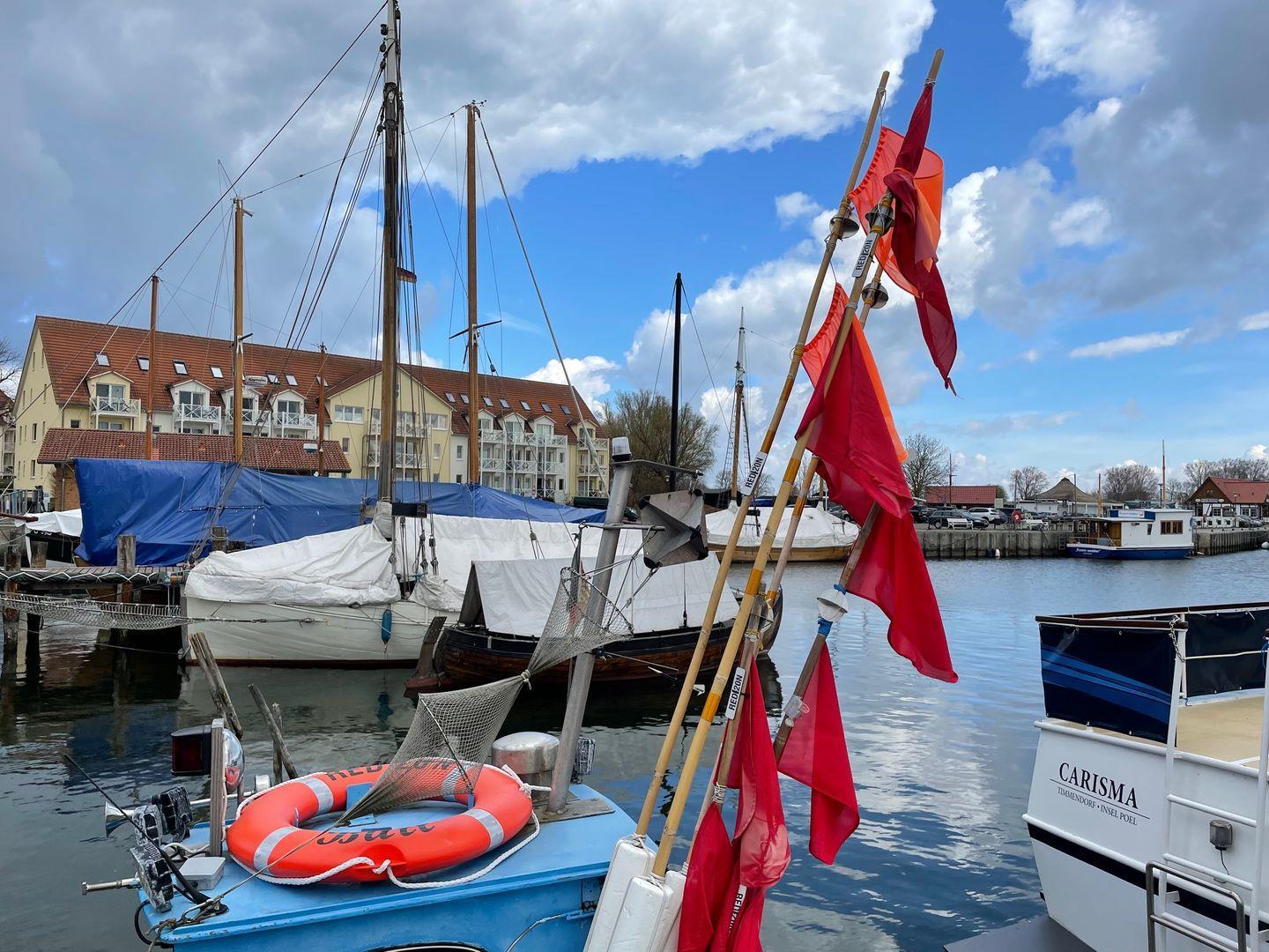 Die Appartementanlage „Residenz am Yachthafen“ befindet sich im Kern des kleinen Örtchens Kirchdorf. Die Appartements verteilen sich auf drei Gebäude mit jeweils zwei Etagen. Zu jedem Appartement gehört ebenfalls ein Pkw - Parkplatz direkt an der Appartementanlage und ein gemeinschaftlich genutzter Fahrradabstellraum im Keller der Appartementanlage. Direkt am Hafen gelegen, bieten Ihnen die Ferienwohnungen alle einen Balkon mit teilweise Meerblick. Hier erleben Sie das bunte Treiben am Hafen von Kirchdorf hautnah und genießen frischen Fisch direkt vom Kutter oder in den umliegenden Restaurants. In den Sommermonaten laden verschiedene Kunst- und Handwerkermärkte zum Schnökern und Bummeln ein. In der nahegelegenen Hansestadt Wismar kommen alle Kultur-, Architektur- und Shoppinginteressierte auf Ihre Kosten. Sie erreichen die UNESCO Welterbestadt entweder mit dem Pkw, dem Fahrrad oder auf dem Wasserweg mit dem Ausflugsschiff, das direkt am Hafen in Kirchdorf mehrmals am Tag ablegt. Um einen Tag am Strand zu genießen, stehen Ihnen mehrere Strände auf der Insel Poel, in alle Himmelsrichtungen verteilt, zur Verfügung. Dazu empfehlen wir Ihnen, dass eigene Fahrrad mitzubringen oder über unsere Agentur „Poeler Tourismus Service“ zu mieten. In wenigen Minuten erreichen Sie mit dem Pkw oder Fahrrad verschiedene Einkaufsmöglichkeiten, Restaurants und Cafés. Außerdem befinden sich öffentliche Ladesäulen für E-Autos auf dem Parkplatz des Hafens.