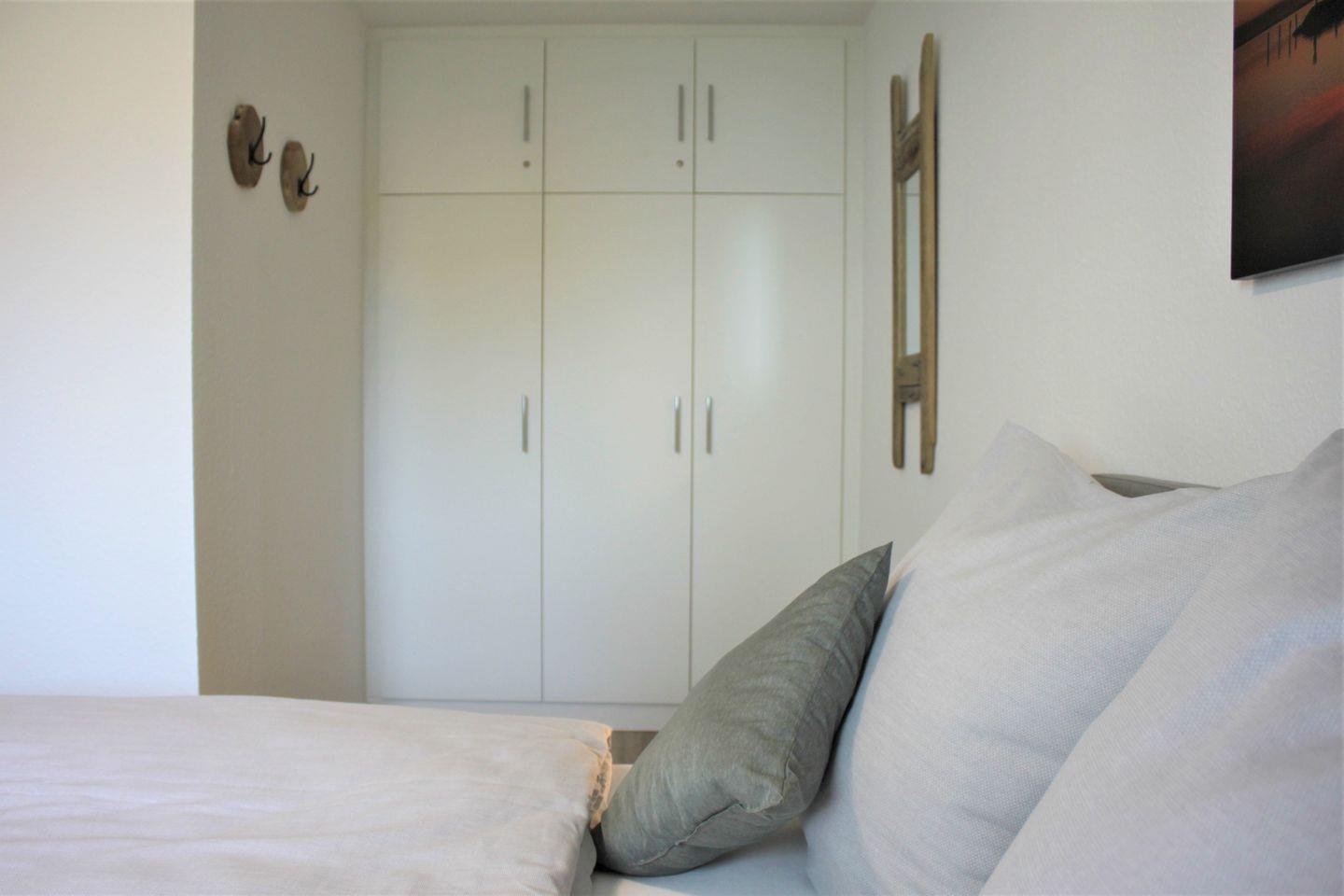 Das moderne Schlafzimmer ist separat und mit einem Polsterbett (160x200cm) und einem Kleiderschrank für Ihre Garderobe möbliert. Eine weitere Person findet auf dem Schlafsofa im Wohnzimmer einen komfortablen Schlafplatz.