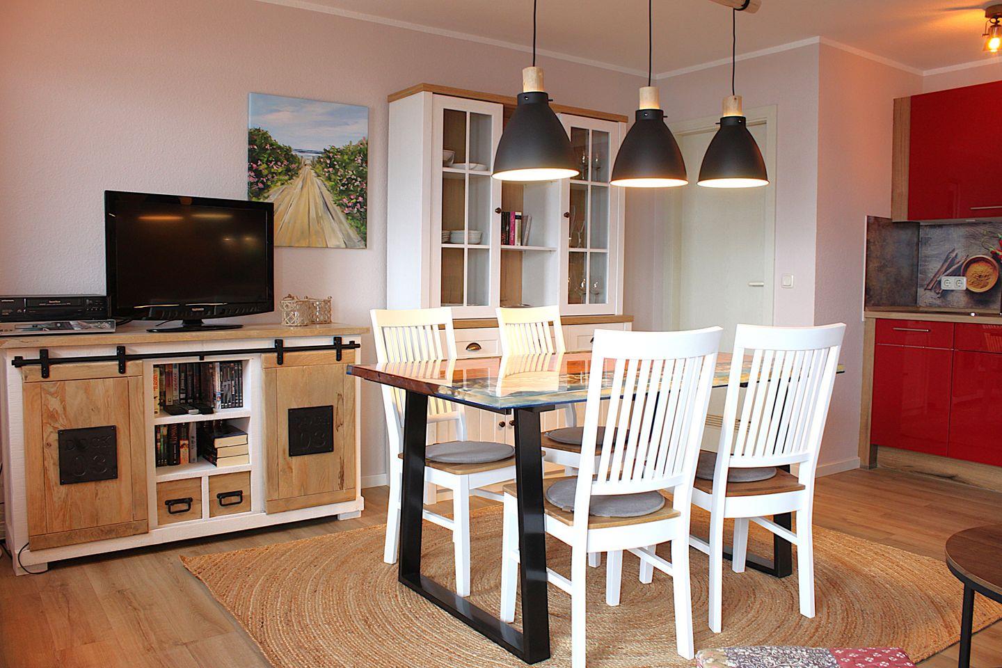 Der kombiniert eingerichtete Wohn- und Essbereich verfügt über eine Couch, einen TV, einen großzügigen Esstisch und eine integrierte Küchenzeile. Diese ist sehr gut ausgestattete und ermöglicht Ihnen eine entspannte Selbstversorgung. Im Wohnbereich finden Sie außerdem den Zugang zum möblierten Balkon mit uneingeschränktem Blick auf die Wismarbucht.