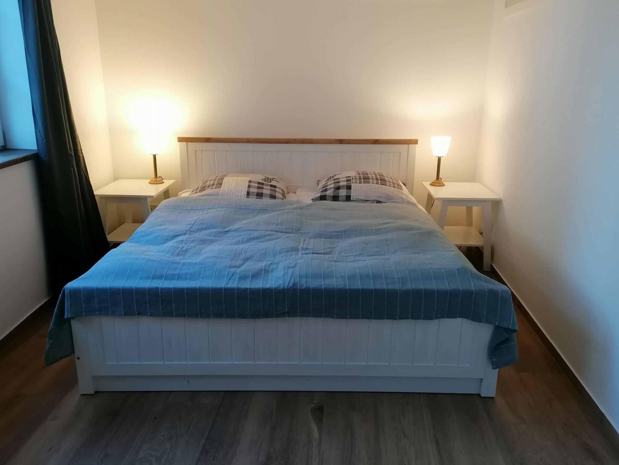 65 qm Wohnfläche mit 60 qm Galerie. Moderne Elektrik mit W-LAN und neuen modernen Bädern(Föhn inklus.) mit barrierefreier Dusche und WC, 1 Schlafzimmer mit Doppelbett 180x200 cm, 1 Wohnzimmer mit Flachbildschirm und Sitzecke, 1 komplett eingerichtete Küche mit Spülmaschine, Backofen, Induktionsfeld, Kühlschrank mit Gefriereinheit, Mikrowelle, Kaffeevollautomat, Toaster, Wasserkocher etc. In der Galerie befinden sich 2 weitere Einzelbetten (jeweils 90x190 cm) und eine Sitzecke mit weiterem Flachbildschirm. Alle Räume haben Tageslicht.