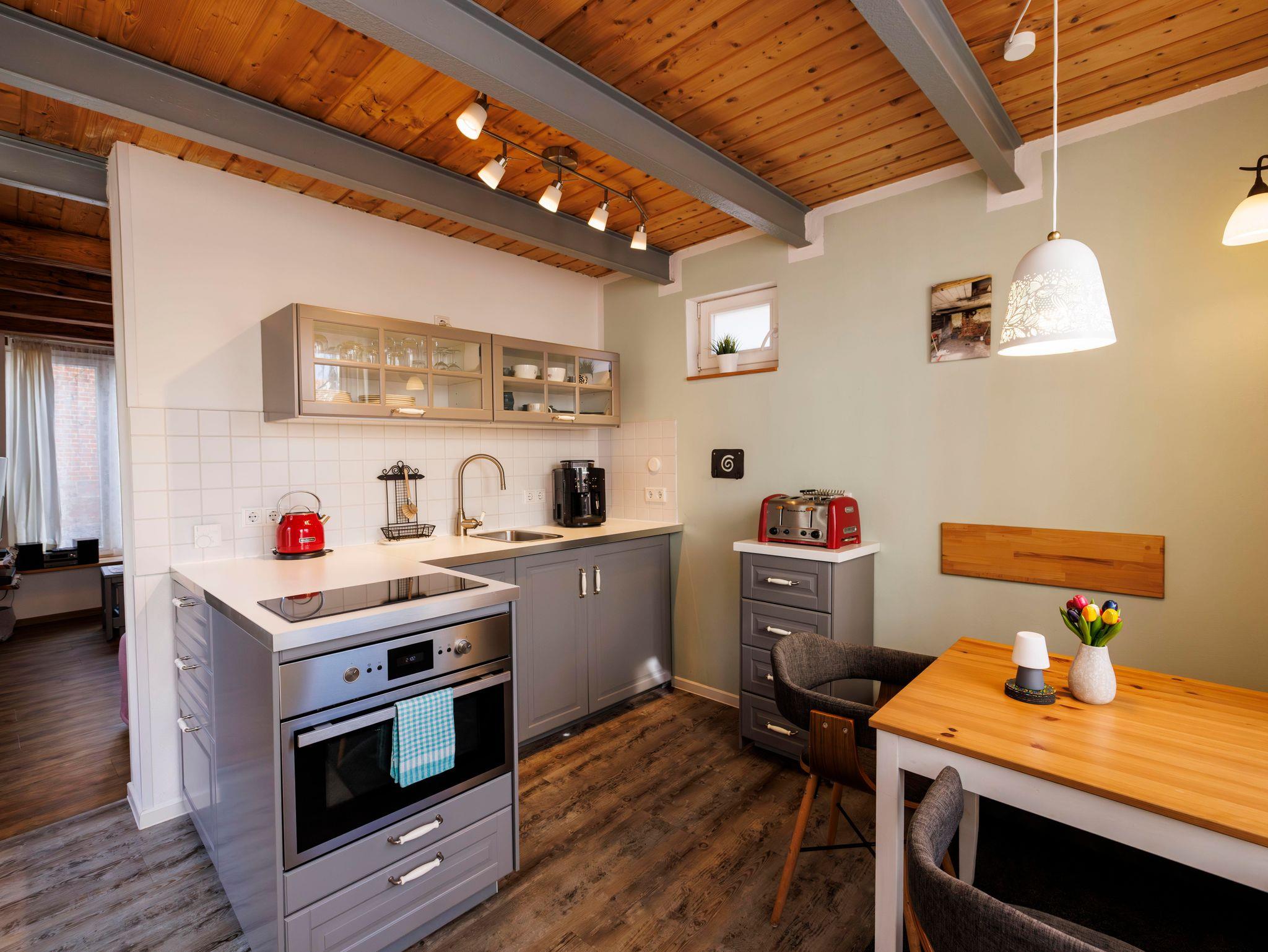 Sie erwartet eine komfortabel eingerichtete Küche in der eine Spülmaschine ebenso selbstverständlich ist, wie Mikrowelle, Backofen und Toaster.