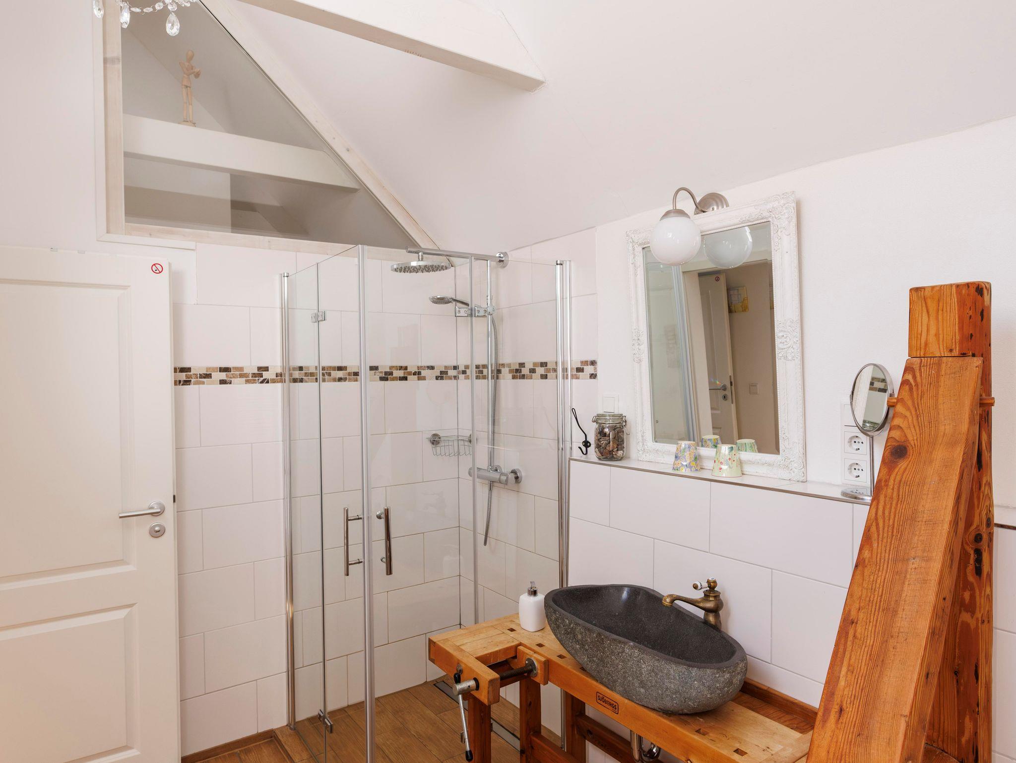 Im Obergeschoss finden Sie ein behagliches Schlafzimmer mit einem großen Doppelbett und zweitem Fernseher sowie ein großzügiges, helles Badezimmer mit Regendusche .