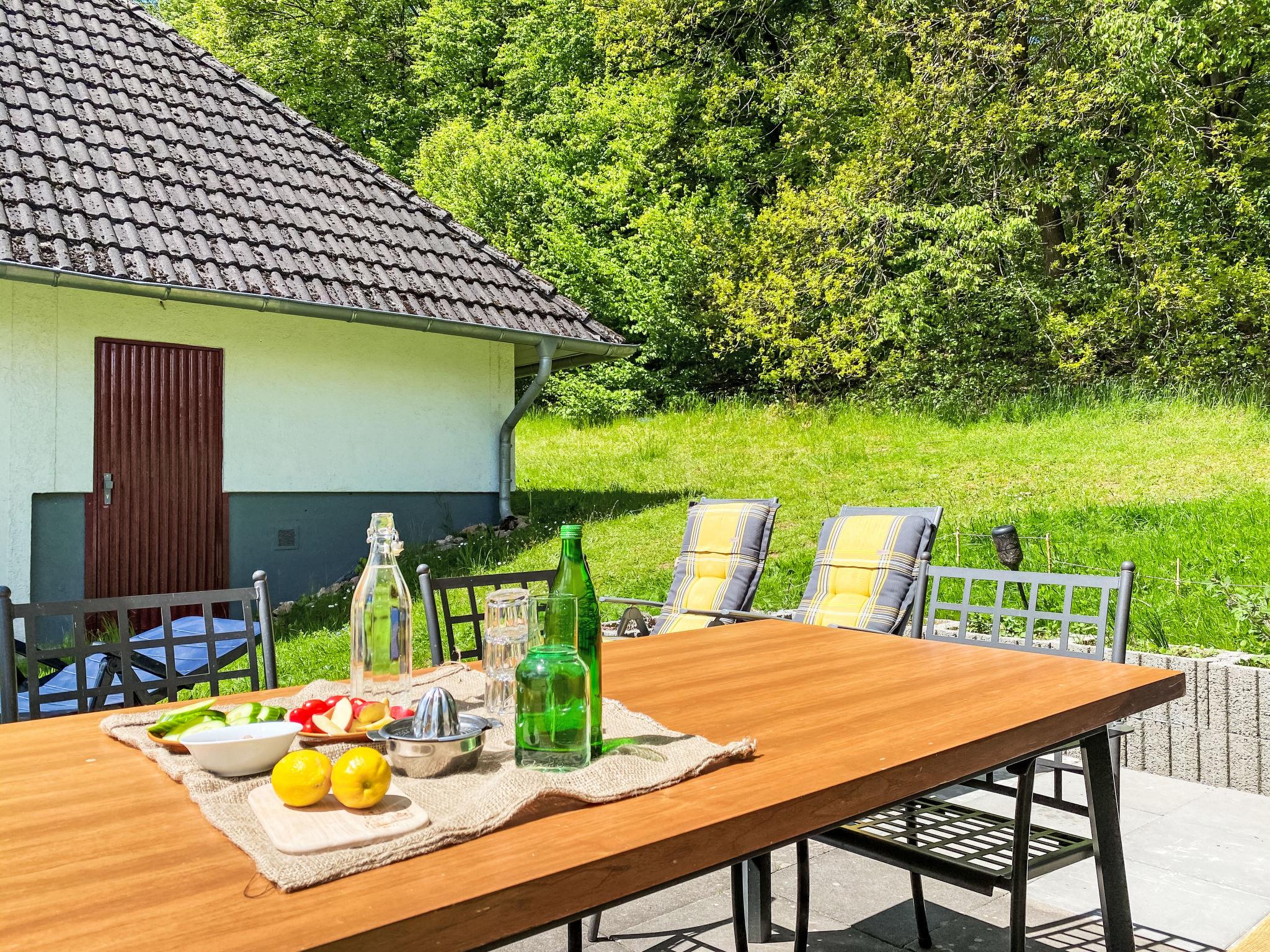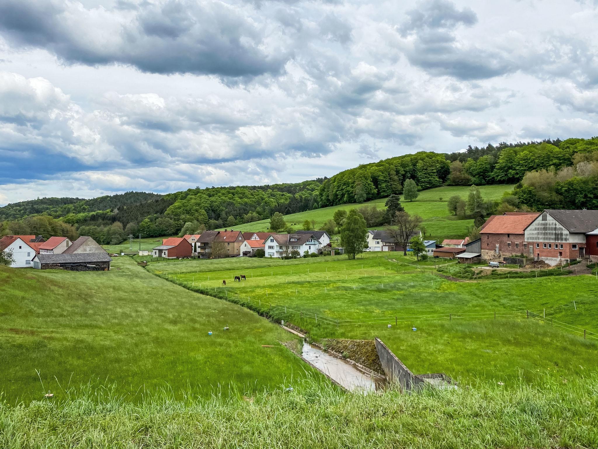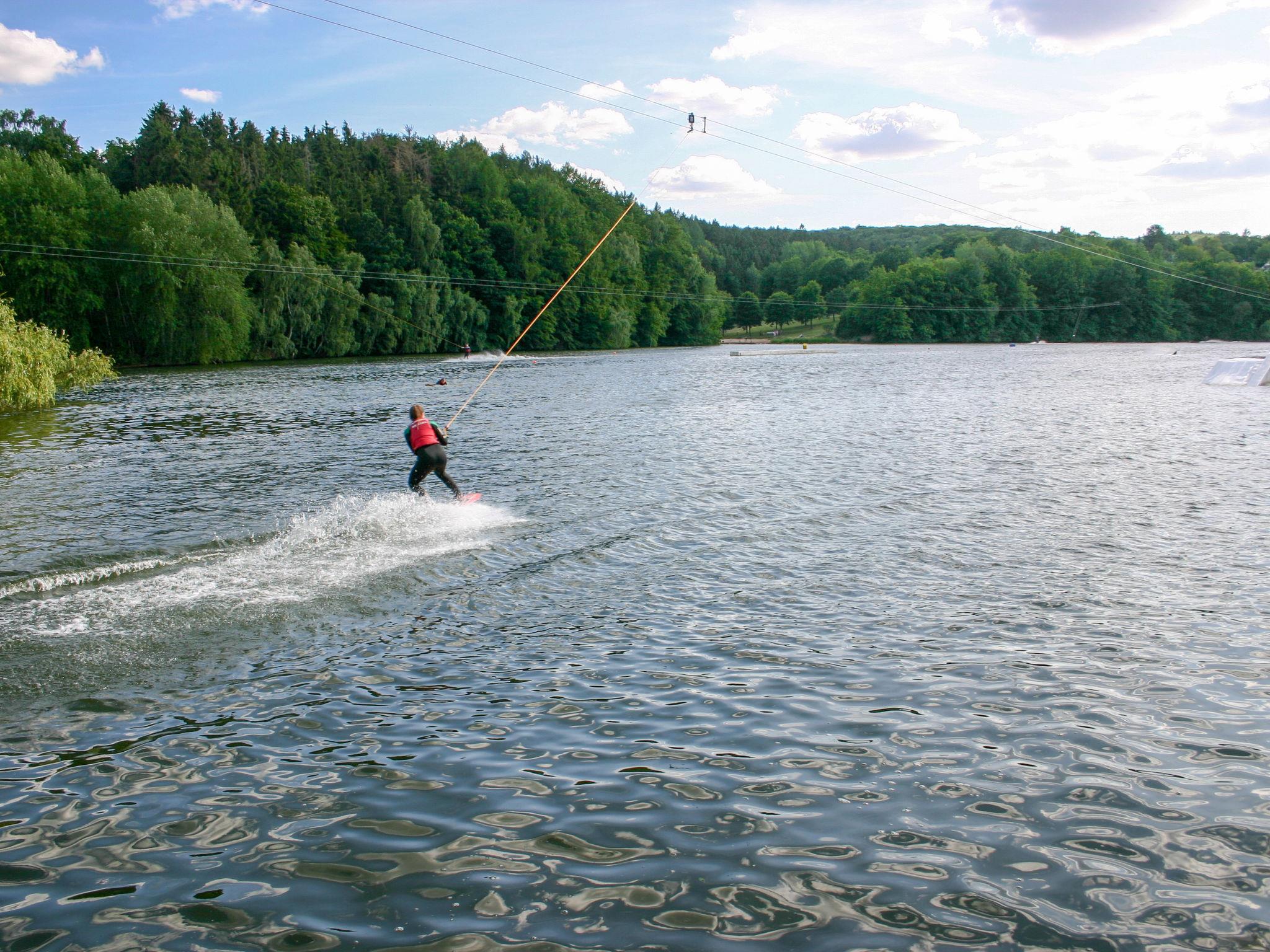 Holiday village "Seepark Kirchheim". Outside the resort, 4 km from the centre of Kirchheim, in a quiet, sunny position on a slope, on the lake, in the countryside. Public parking on the road. Shop 4 km, supermarket 4 km, shopping centre 4 km, bakery 4 km, café 400 m, bus stop 400 m, railway station "Bad Hersfeld" 15 km, outdoor swimming pool 4 km, thermal baths 15 km. Golf course (18 hole) 4 km, tennis 10 km, minigolf 15 km, walking paths from the house 300 m. Well-known lakes can easily be reached: Stausee 500 m. Please note: car recommended. The owner does not accept any youth groups. The Seepark is divided into four “villages” with a total of 139 holiday homes, which are grouped around the reservoir (10 hectares of water, bathing, water skiing, sunbathing area). Route around lake is ideal for walking and jogging.