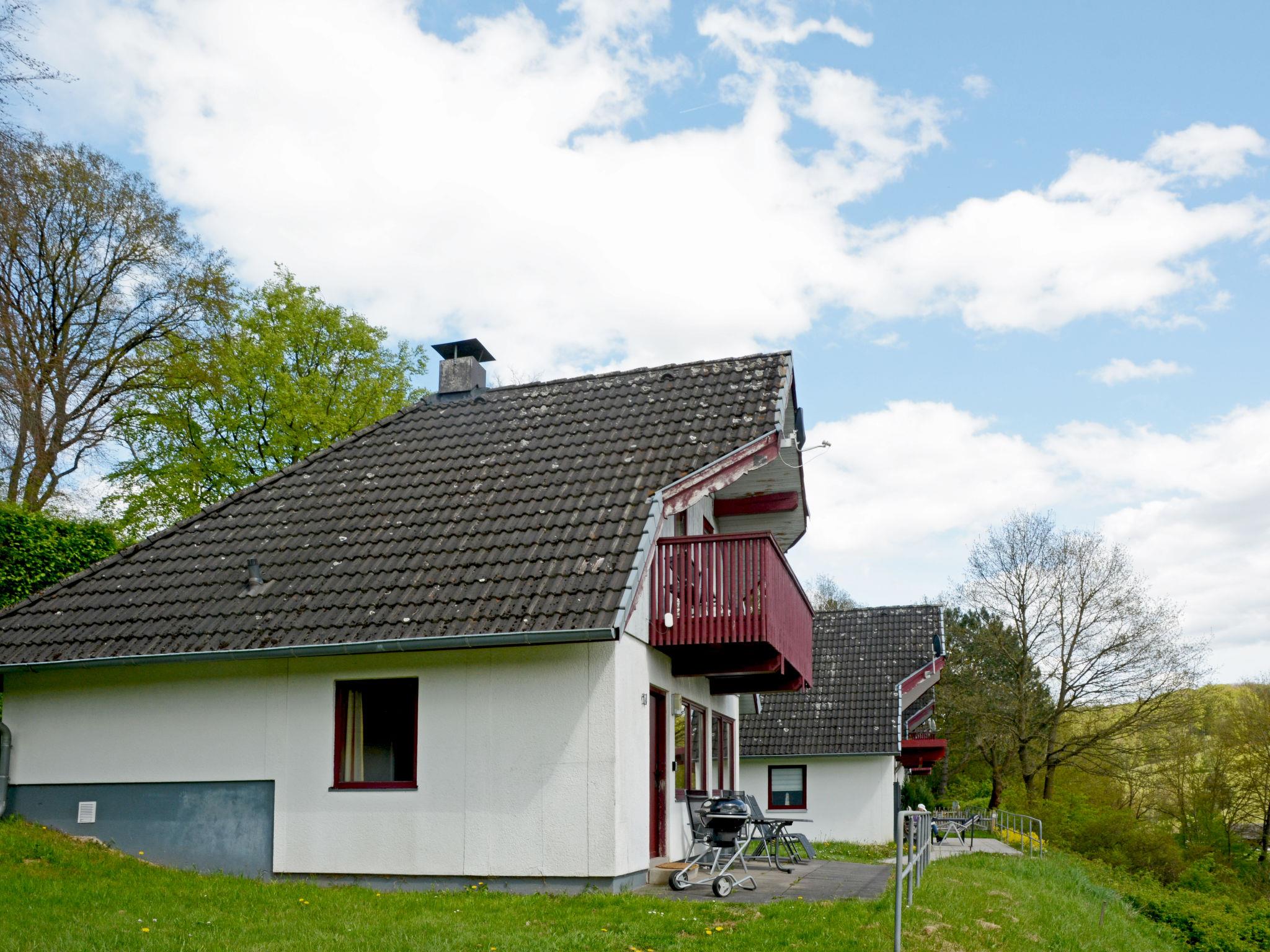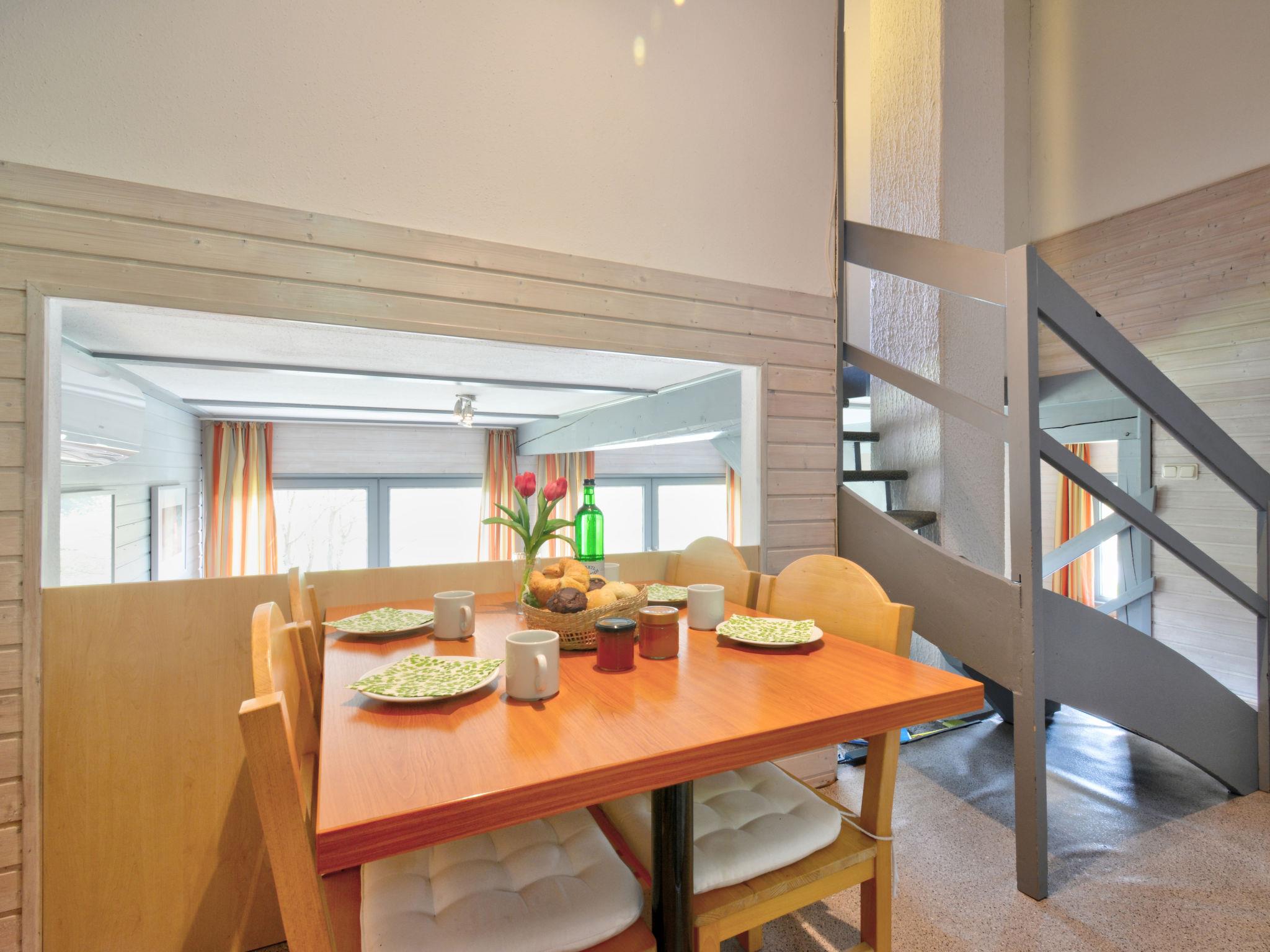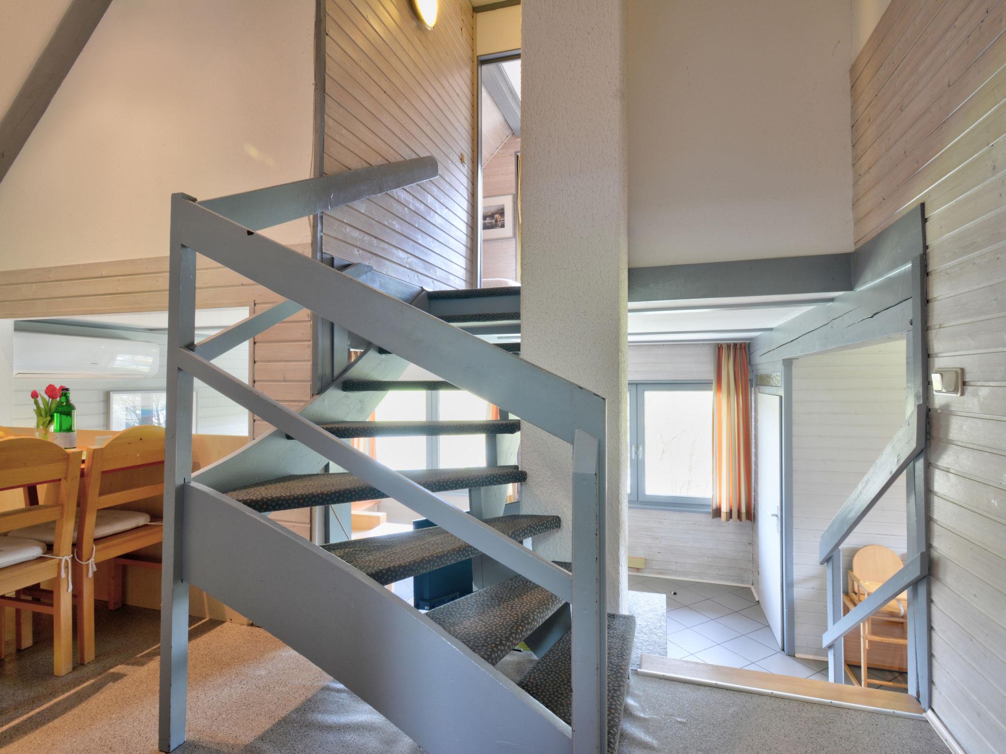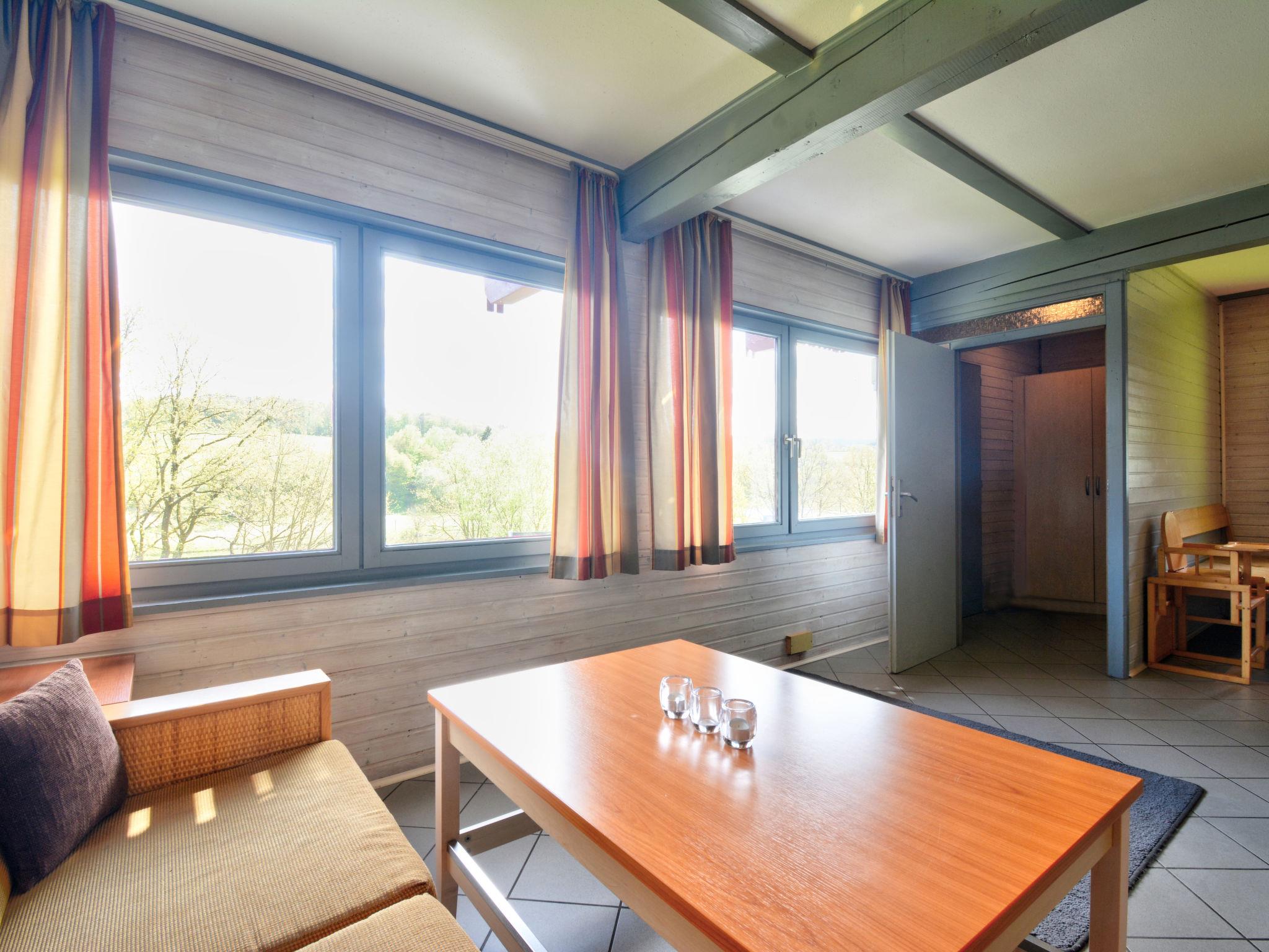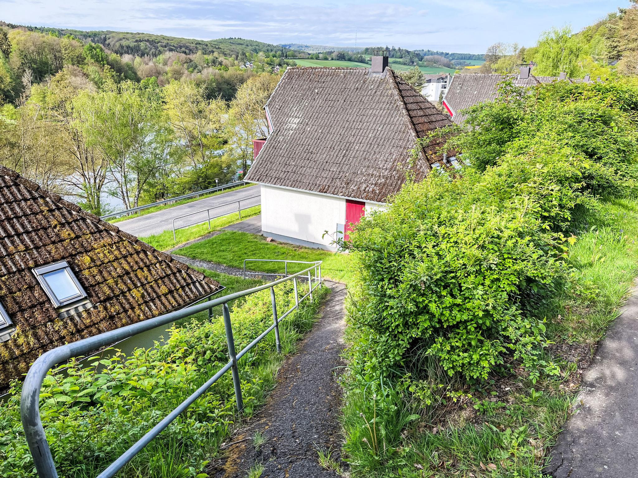"Dorf 1/Haus 14", 4-room house 75 m2 on 2 levels, on the ground floor. Cosy furnishings: living/dining room 22 m2 with open-hearth fireplace and satellite TV (flat screen). Exit to the terrace, to the patio. 1 room 12 m2, with sloping ceilings with 2 beds (90 cm, length 200 cm). Open kitchen 8 m2 (mini-oven, 4 ceramic glass hob hotplates, microwave, electric coffee machine). Shower/WC, sep. WC. Upper floor: (spiral staircase), 2 rooms 10 m2, with sloping ceilings, each room with 2 beds (90 cm, length 200 cm), hand-basin. Exit to the balcony. Electric heating. Small balcony 5 m2, terrace 10 m2 partly roofed, patio 30 m2, lawn 30 m2. Terrace furniture, balcony furniture, barbecue (portable). Beautiful view of the lake and the countryside. Facilities: children's high chair, logs (extra). Parking at 100 m. Please note: non-smoking house. Maximum 2 pets/ dogs allowed. Smoke alarm, fire extinguisher. On the ground floor, the rooms are connected by stairs(mezzanine). Distance to the reservoir: 200 m. Steep path from the car park to the house.
