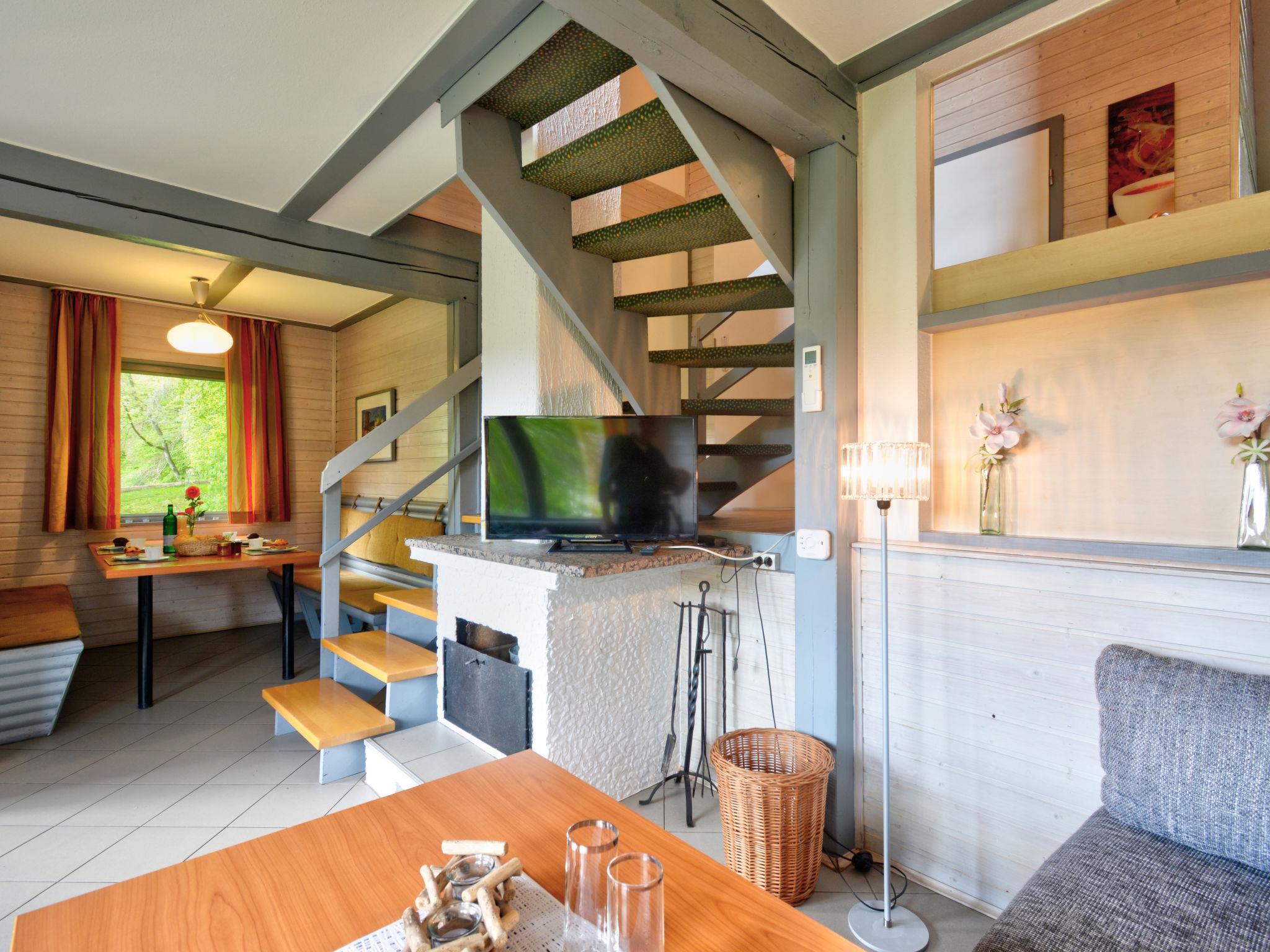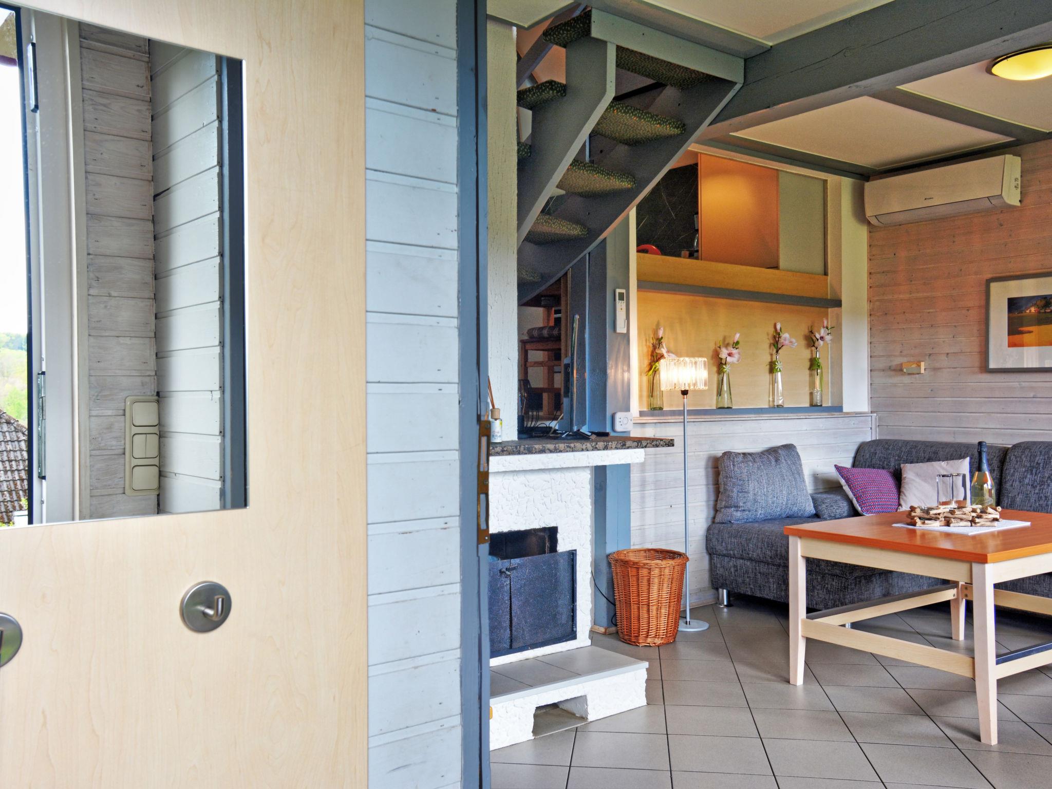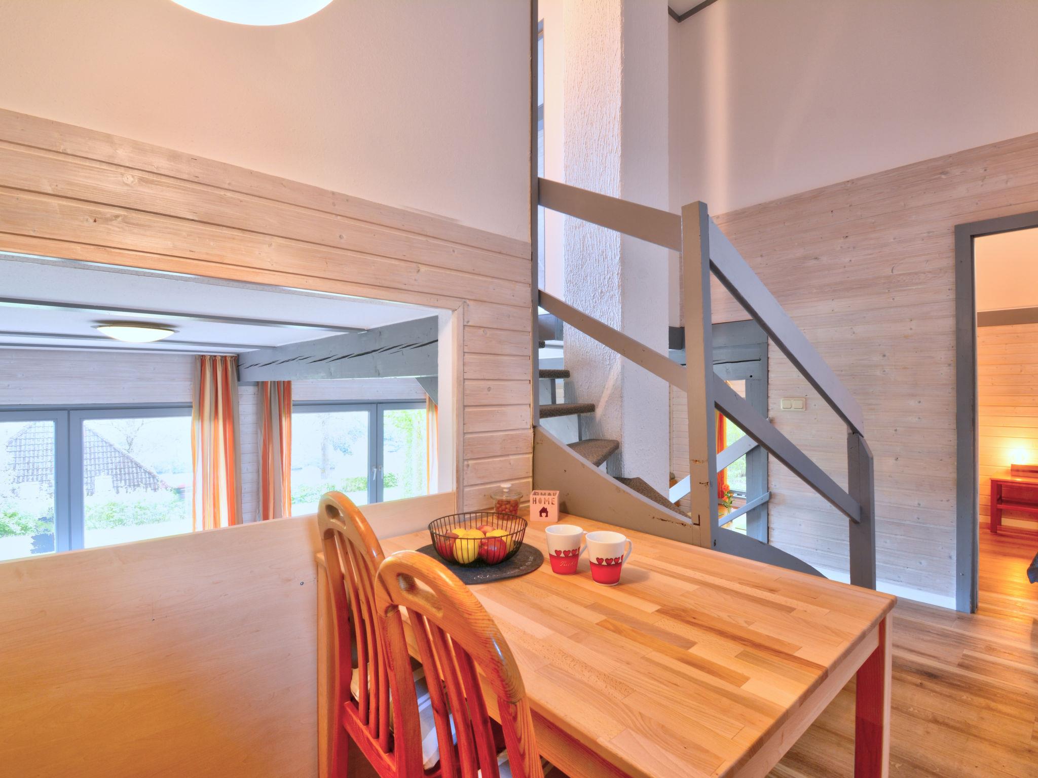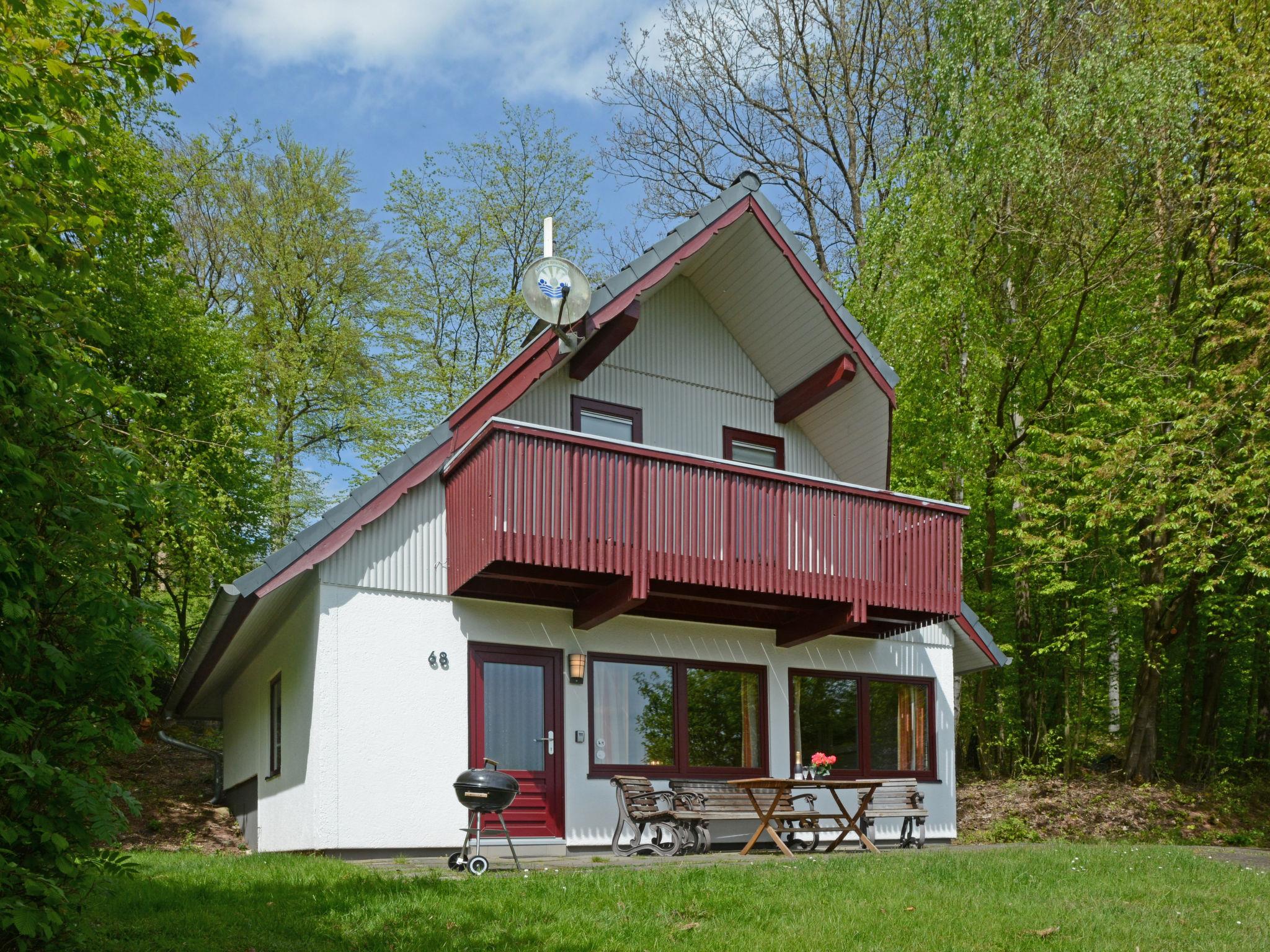 "Dorf 2/Haus 68", 4-room house 75 m2 on 2 levels, on the ground floor. Partly renovated in 2023, cosy furnishings: living/dining room 22 m2 with open-hearth fireplace and satellite TV (flat screen), hi-fi system. Exit to the terrace, to the patio. 1 room 12 m2, with sloping ceilings with 2 beds (90 cm, length 200 cm). Open kitchen 8 m2 (mini-oven, 2 ceramic glass hob hotplates, microwave, electric coffee machine). Shower/WC, sep. WC. Upper floor: (spiral staircase), 1 room 10 m2, with sloping ceilings with 2 beds (90 cm, length 200 cm), hand-basin. Exit to the balcony. 1 room with sloping ceilings with 1 bed and hand-basin. Electric heating. Small balcony 5 m2, terrace 10 m2 partly roofed, patio 30 m2, lawn 50 m2. Terrace furniture, balcony furniture, barbecue (portable). Beautiful view of the lake and the countryside. Facilities: children's high chair, baby cot, logs (extra). Internet (WiFi, free). Please note: non-smoking house. Maximum 2 pets/ dogs allowed. Smoke alarm, fire extinguisher. On the ground floor, the rooms are connected by stairs (mezzanine). Distance to the reservoir: 400 m.