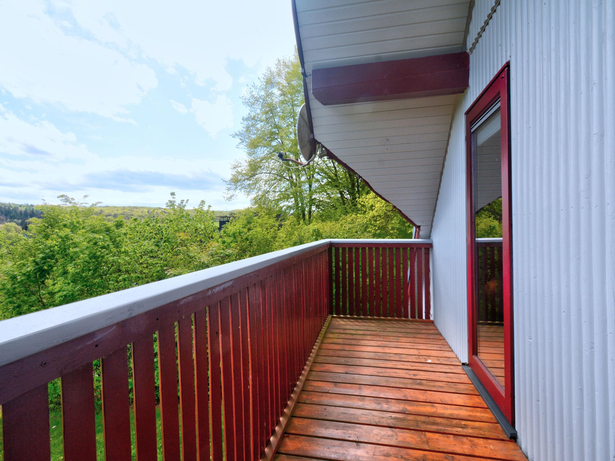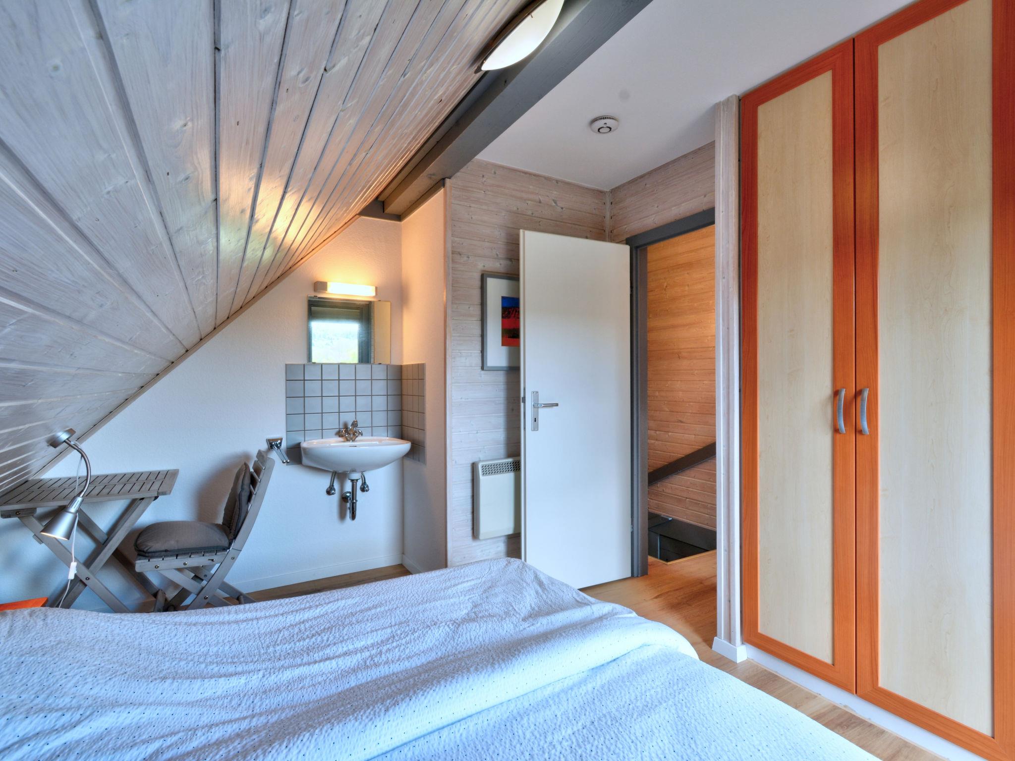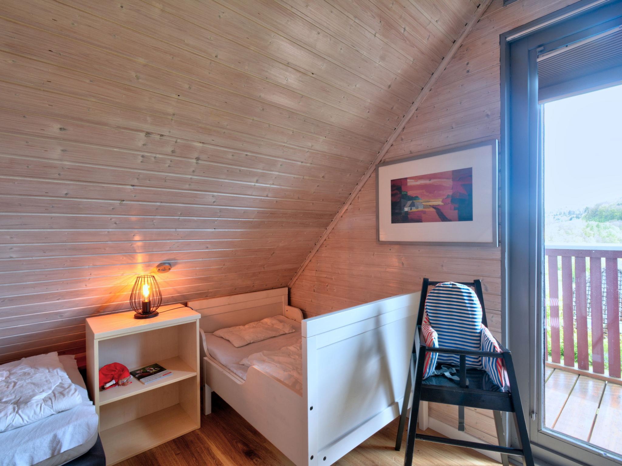 "Dorf 2/Haus 68", 4-room house 75 m2 on 2 levels, on the ground floor. Partly renovated in 2023, cosy furnishings: living/dining room 22 m2 with open-hearth fireplace and satellite TV (flat screen), hi-fi system. Exit to the terrace, to the patio. 1 room 12 m2, with sloping ceilings with 2 beds (90 cm, length 200 cm). Open kitchen 8 m2 (mini-oven, 2 ceramic glass hob hotplates, microwave, electric coffee machine). Shower/WC, sep. WC. Upper floor: (spiral staircase), 1 room 10 m2, with sloping ceilings with 2 beds (90 cm, length 200 cm), hand-basin. Exit to the balcony. 1 room with sloping ceilings with 1 bed and hand-basin. Electric heating. Small balcony 5 m2, terrace 10 m2 partly roofed, patio 30 m2, lawn 50 m2. Terrace furniture, balcony furniture, barbecue (portable). Beautiful view of the lake and the countryside. Facilities: children's high chair, baby cot, logs (extra). Internet (WiFi, free). Please note: non-smoking house. Maximum 2 pets/ dogs allowed. Smoke alarm, fire extinguisher. On the ground floor, the rooms are connected by stairs (mezzanine). Distance to the reservoir: 400 m.