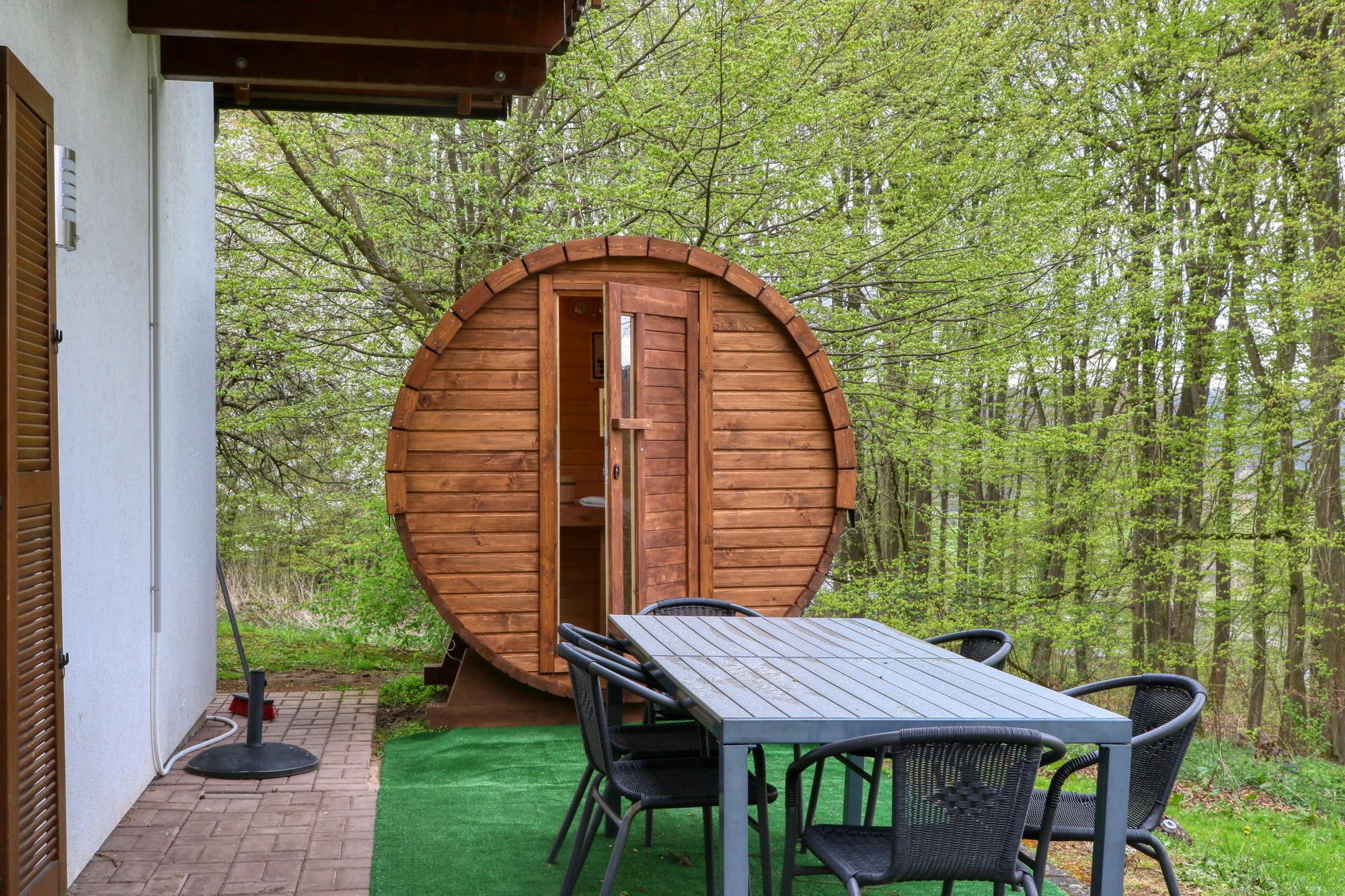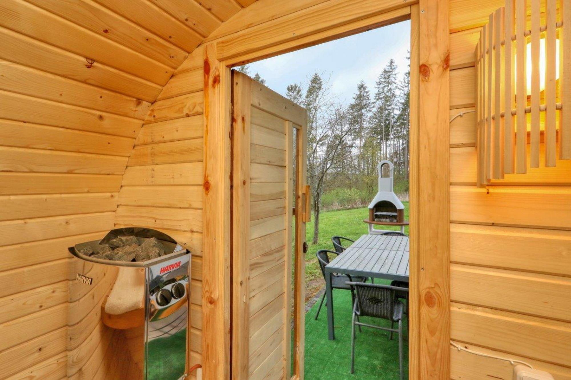 Auf der nicht einsehbaren Terrasse steht Ihnen ein Grillkamin für gemütliche Abende zur Verfügung. Von der Terrasse betreten Sie die Sauna, wo Sie jederzeit ungestört entspannen können.