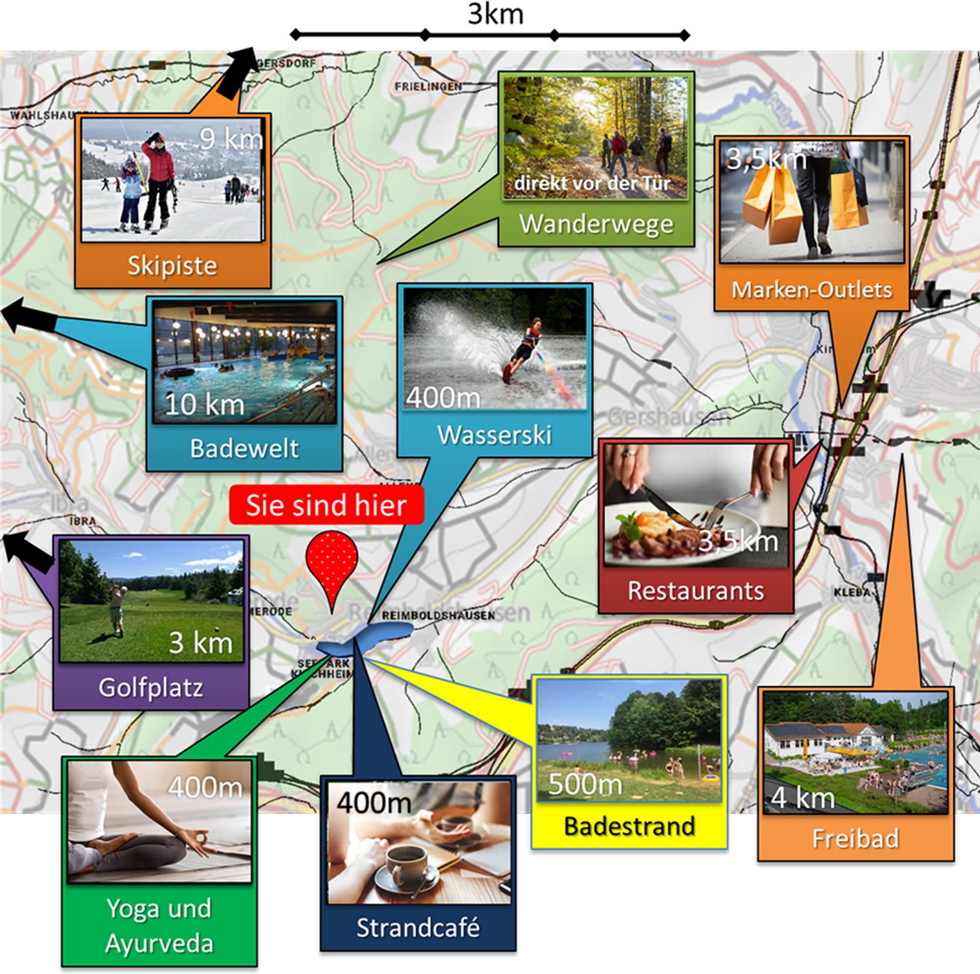 Afstande fra ferieboligen og placering på kort